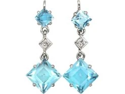 A smart pair of 18ct75% pure gold (or 750 parts pure gold and 250 parts other metals) white goldWhite gold is an alloy of gold and at least one other white metal – most often nickel or palladium (both of which act as a bleaching agent to reduce the natural yellow colour of the gold). drop earrings. They were made in the 1920s and are typical of that period. The clawA precious metal prong used to hold a gemstone in place. set square cut aquamarines have been tipped to form diamondA precious, lustrous gemstone made of highly compressed carbon. Diamonds are one of the hardest materials known to mankind. Colours of diamonds range from colourless, yellow, orange and brown to almost black. Natural coloured (or ‘fancy’) diamonds can be extremely rare. The cut, colour, clarity and carat weight of a diamond are the criteria jewellers use… shaped drops with a small diamond above each one and another smaller diamond shaped aquamarineAquamarine (from the Latin, “water from the sea”) is a blue variety of the mineral, beryl, of which emerald is the less durable but more prized green variety. Aquamarine was believed to protect sailors at sea and banish fear. in a tipped square setting at the top. The aquamarines are a lovely sea blue colour and are well matched stones. These earrings can be worn day and night.