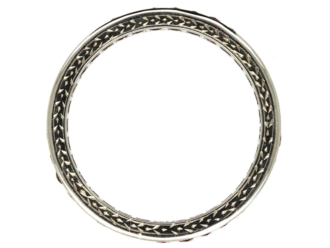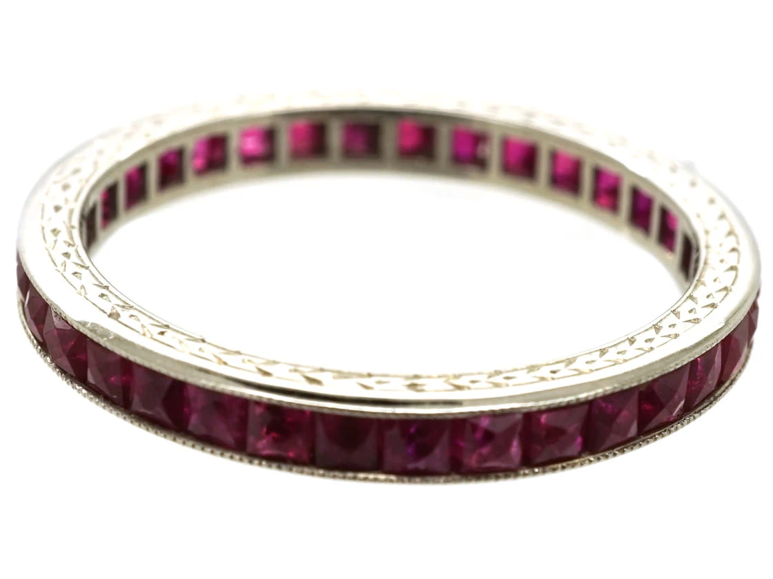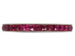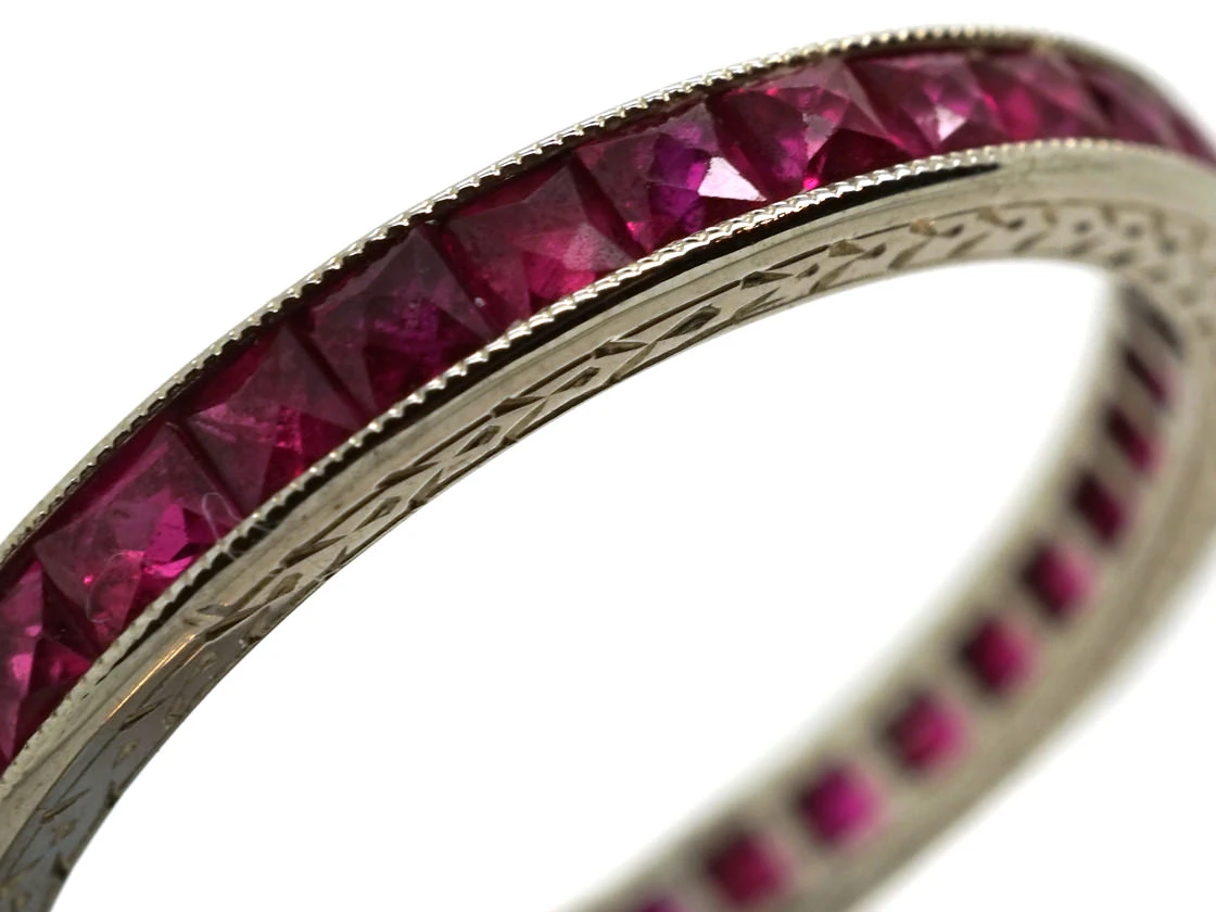 set with rubies that have been cut with a French cut which is slightly more unusual than the square cut stones that are normally set in these eternity rings. The sides of the shankThe circle of metal that attaches to the decorative part of a ring and encircles the finger. have been engraved with a continuous leaf design. This ring would look good worn on its own or stacked with other eternity rings set with different gemstones.