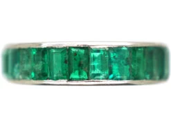 is prone to getting knocked. Having said that it is difficult to find emeraldOne of the four âpreciousâ stones. An intense, deep green is the most desirable colour for emeralds. Flaws and cloudiness (âjardinâ) are very common in emeralds, so stones are often oiled, irradiated, and dyed to improve their look. Synthetic emeralds have fewer imperfections and are hard to set apart from natural stones. Emeralds belong to the beryl… eternity bands so this one is lovely especially as it has a total weight of three caratsThe unit of weight for a diamond or other gemstone and also for a pearl. Abbreviated ‘ct’, 1 carat is equal to 0.2 grams. In reference to gold, a unit of purity or fineness of gold and gold alloy, expressed as a number out of 24 parts by weight, e.g. ’24 carat’ signifies pure gold, ’18 carat’ 18/24th gold in the alloy, et cetera. Also abbreviated as ‘c… of Colombian emeralds. It was made in the 1930s. This ring cannot be sized.