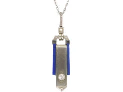 A very stylish 18ct75% pure gold (or 750 parts pure gold and 250 parts other metals) white goldWhite gold is an alloy of gold and at least one other white metal – most often nickel or palladium (both of which act as a bleaching agent to reduce the natural yellow colour of the gold). Art DecoA movement within the arts between the two Great Wars (1920-1935) across Europe and the US, characterized by its clean, geometric designs. The aesthetic was intended to celebrate an age of progress and the modernity of the machine. pendant that was made in the 1920s. It is typical of the period in it’s geometric design. It gives the impression of a stylised ribbon or tie set with a diamondA precious, lustrous gemstone made of highly compressed carbon. Diamonds are one of the hardest materials known to mankind. Colours of diamonds range from colourless, yellow, orange and brown to almost black. Natural coloured (or ‘fancy’) diamonds can be extremely rare. The cut, colour, clarity and carat weight of a diamond are the criteria jewellers use… within a millgrained setting. The hint of the deep blue colour of the lapis lazuliAn historically popular deep blue opaque gemstone. Lapis Lazuli is chiefly composed of the mineral Lazurite and is often flecked with gold Pyrite, giving each stone a unique mysticism. on either side accentuates the design. The top articulates so it sits well on the neck when worn. It is on a 9ct37.5% pure gold (or 375 parts pure gold and 625 parts other metals) white gold chain