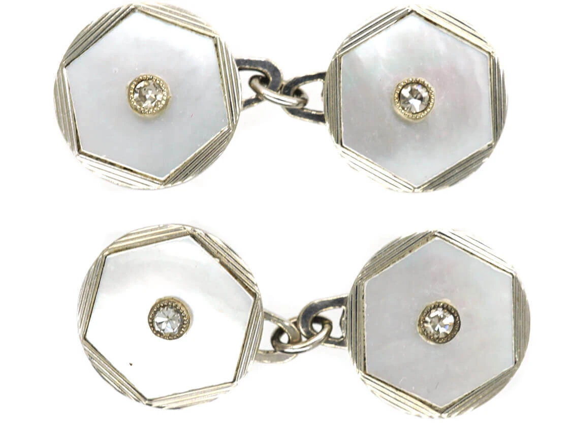 A smart pair of 18ct75% pure gold (or 750 parts pure gold and 250 parts other metals) white goldWhite gold is an alloy of gold and at least one other white metal – most often nickel or palladium (both of which act as a bleaching agent to reduce the natural yellow colour of the gold). cufflinks that were made in the 1920s. They are typical of the Art DecoA movement within the arts between the two Great Wars (1920-1935) across Europe and the US, characterized by its clean, geometric designs. The aesthetic was intended to celebrate an age of progress and the modernity of the machine. period with their octagonal design and mother of pearlThe iridescent inner layer of certain molluscs such as oysters or abalones which is used as a decorative inlay. settings surrounding the small diamonds.