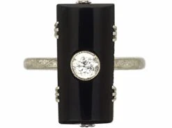 A stylish 18ct white gold ring that was made in the Art Deco period in the mid 1920s. At that time Skyscrapers were invented and built in geometric form. The style spread to furniture, textiles and jewellery. This ring is a simple stark construction with a triple claw set rectangular plaque of onyx that has been collet set with one bright white diamond in the centre. The shank is 18ct white gold and has been engraved with stylised leaves around the sides and on the shoulders.