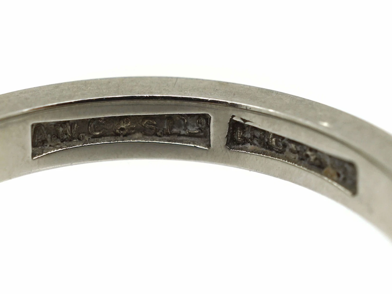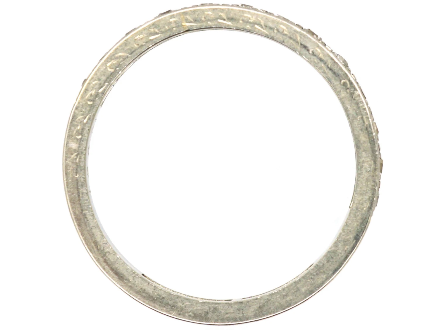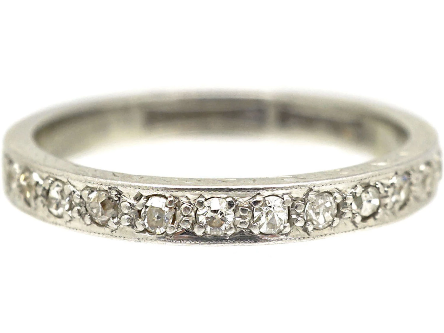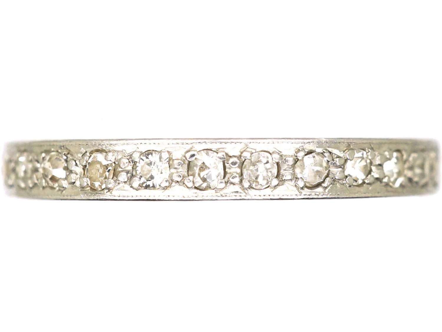 A pretty 18ct75% pure gold (or 750 parts pure gold and 250 parts other metals) white goldWhite gold is an alloy of gold and at least one other white metal – most often nickel or palladium (both of which act as a bleaching agent to reduce the natural yellow colour of the gold). ring that was made in the 1920s. It is a half eternity bandA type of ring which is an equal width all the way round. They are traditionally used for wedding rings.