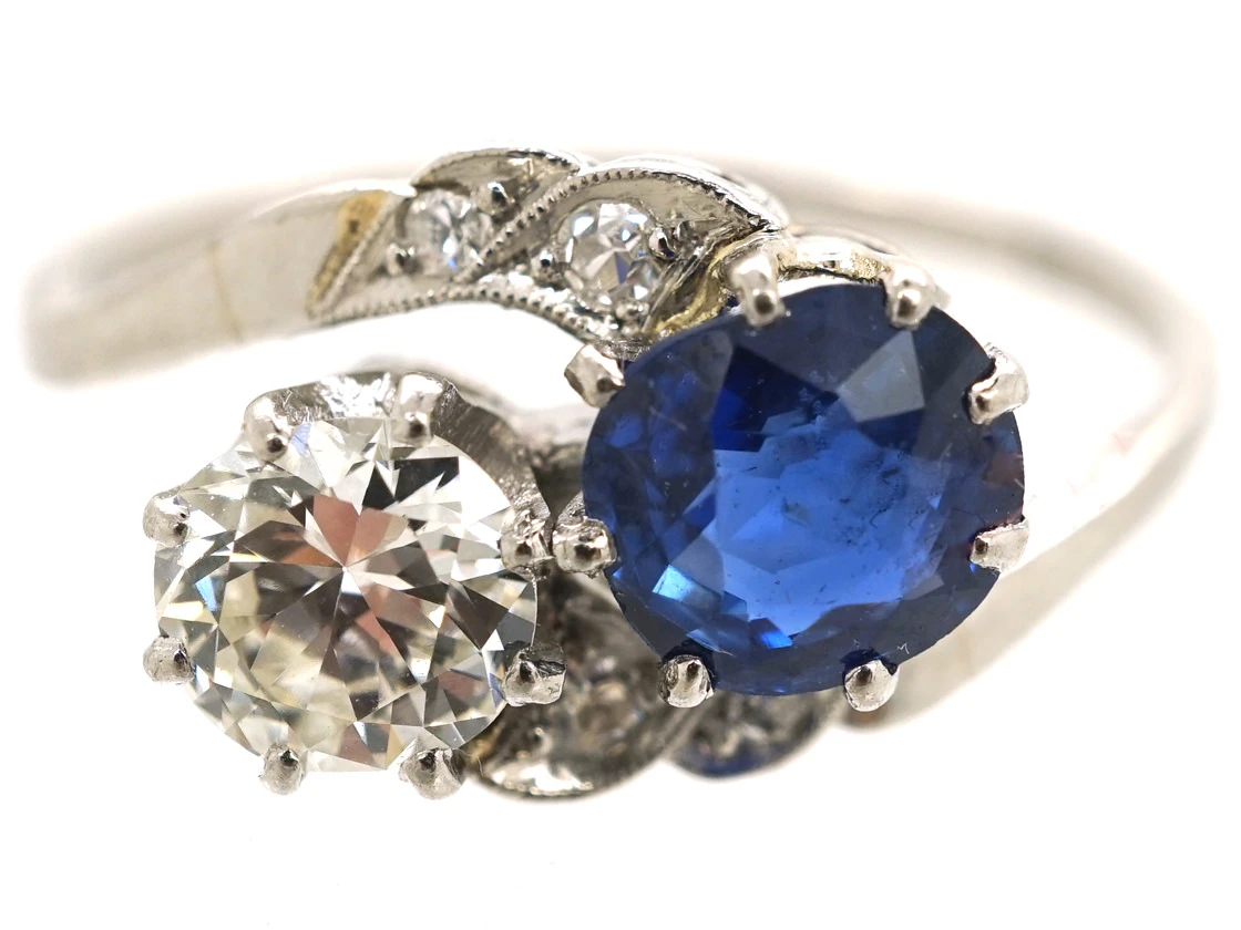 and a diamondA precious, lustrous gemstone made of highly compressed carbon. Diamonds are one of the hardest materials known to mankind. Colours of diamonds range from colourless, yellow, orange and brown to almost black. Natural coloured (or ‘fancy’) diamonds can be extremely rare. The cut, colour, clarity and carat weight of a diamond are the criteria jewellers use… with diamond set shouldersThe point on a ring where the central section meets the shank or band, often carved, decorated or inlaid with small diamond accent stones.. The diamond is a good clear white stone and the sapphire is a lovely mid blue naturalA natural stone is called such because it has not been subjected to any treatments. stone. There is good attention to detail with scalloped shoulders and millgrain work. It would make an ideal engagement ring.