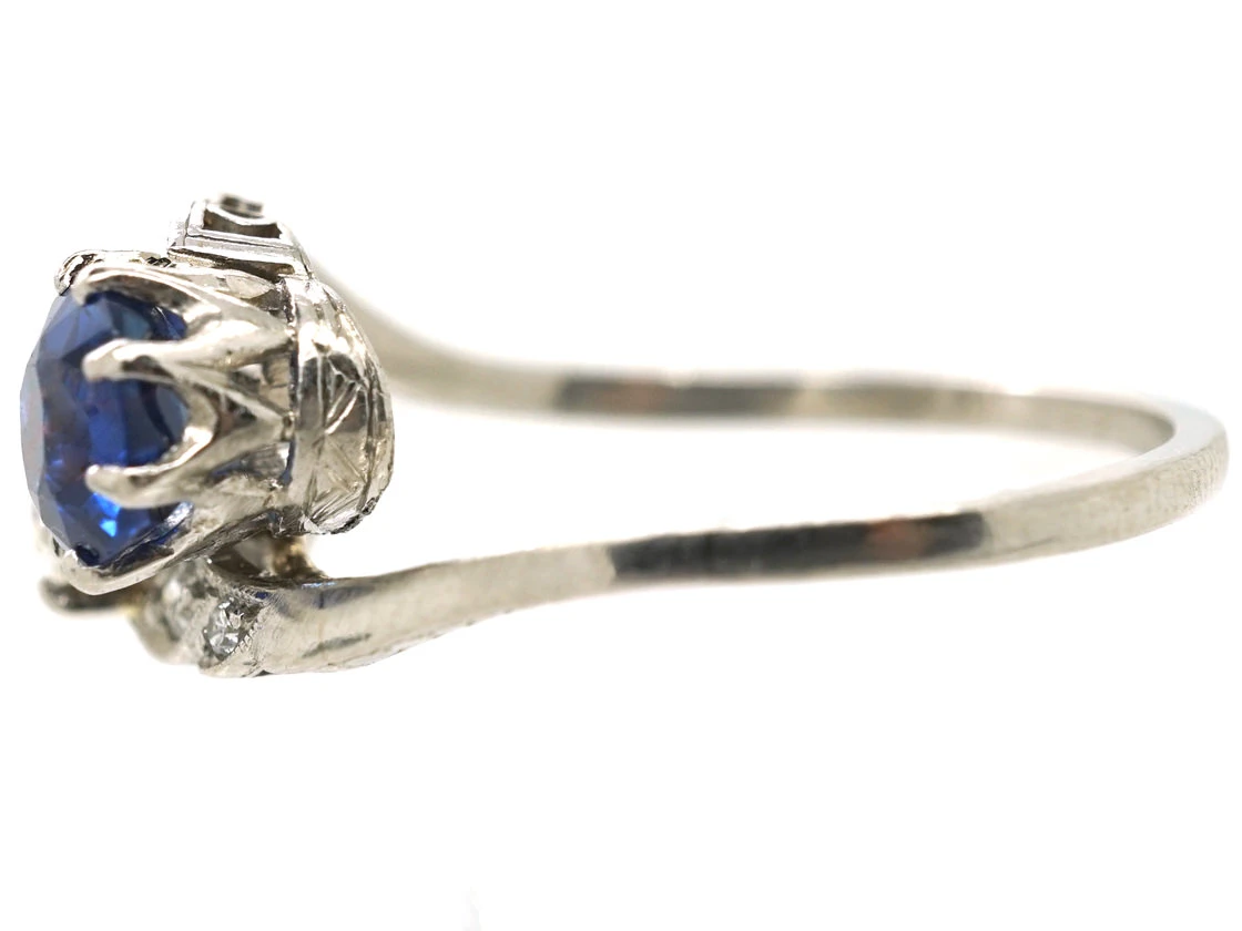 A pretty Art DecoA movement within the arts between the two Great Wars (1920-1935) across Europe and the US, characterized by its clean, geometric designs. The aesthetic was intended to celebrate an age of progress and the modernity of the machine. 18ct75% pure gold (or 750 parts pure gold and 250 parts other metals) white goldWhite gold is an alloy of gold and at least one other white metal – most often nickel or palladium (both of which act as a bleaching agent to reduce the natural yellow colour of the gold). ring made circa 1920. It is set with a sapphireBlue is the best-known colour for this gemstone but it can be found in all colours of the spectrum. After diamond, sapphire is the hardest gemstone.