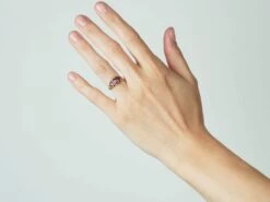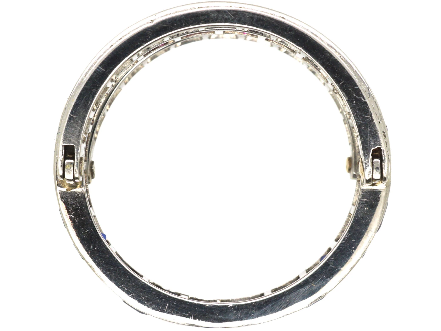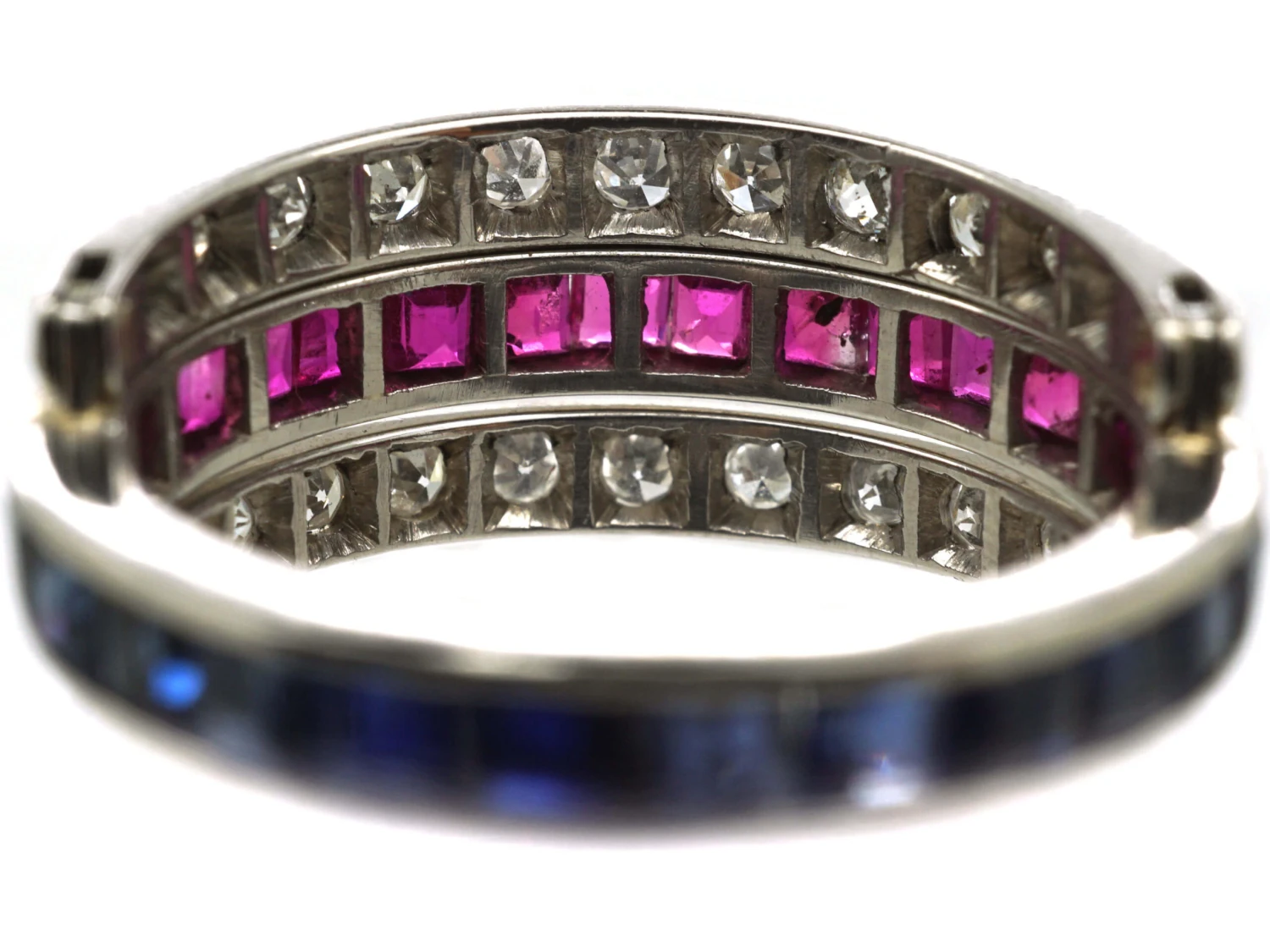 A lovely 18ct75% pure gold (or 750 parts pure gold and 250 parts other metals) white goldWhite gold is an alloy of gold and at least one other white metal – most often nickel or palladium (both of which act as a bleaching agent to reduce the natural yellow colour of the gold). Art DecoA movement within the arts between the two Great Wars (1920-1935) across Europe and the US, characterized by its clean, geometric designs. The aesthetic was intended to celebrate an age of progress and the modernity of the machine. flip over ring. The beauty of it is that you can hinge over the two sides to either show rubies on either side of the diamonds, or sapphires on either side, so you have two rings in one. These rings were really popular in the 1920s and are as wearable now as they were then. Please note that this style cannot be sized.