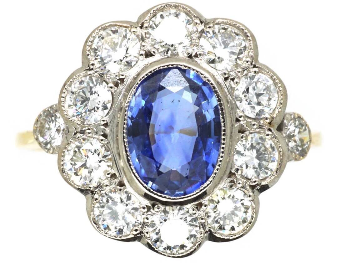 This is a stunning 18ct75% pure gold (or 750 parts pure gold and 250 parts other metals) gold ring with a platinumDerives from the Spanish word ‘platina’ meaning ‘little silver’. Acknowledged since the 1900s, platinum’s durability and natural brightness has been and still is today highly treasured A metallic element prized for its rarity, whiteness, high tensile strength and insusceptibility to corrosion, platinum first became widely used in jewellery in the late ninete… top. It has been set with an oval sapphireBlue is the best-known colour for this gemstone but it can be found in all colours of the spectrum. After diamond, sapphire is the hardest gemstone.