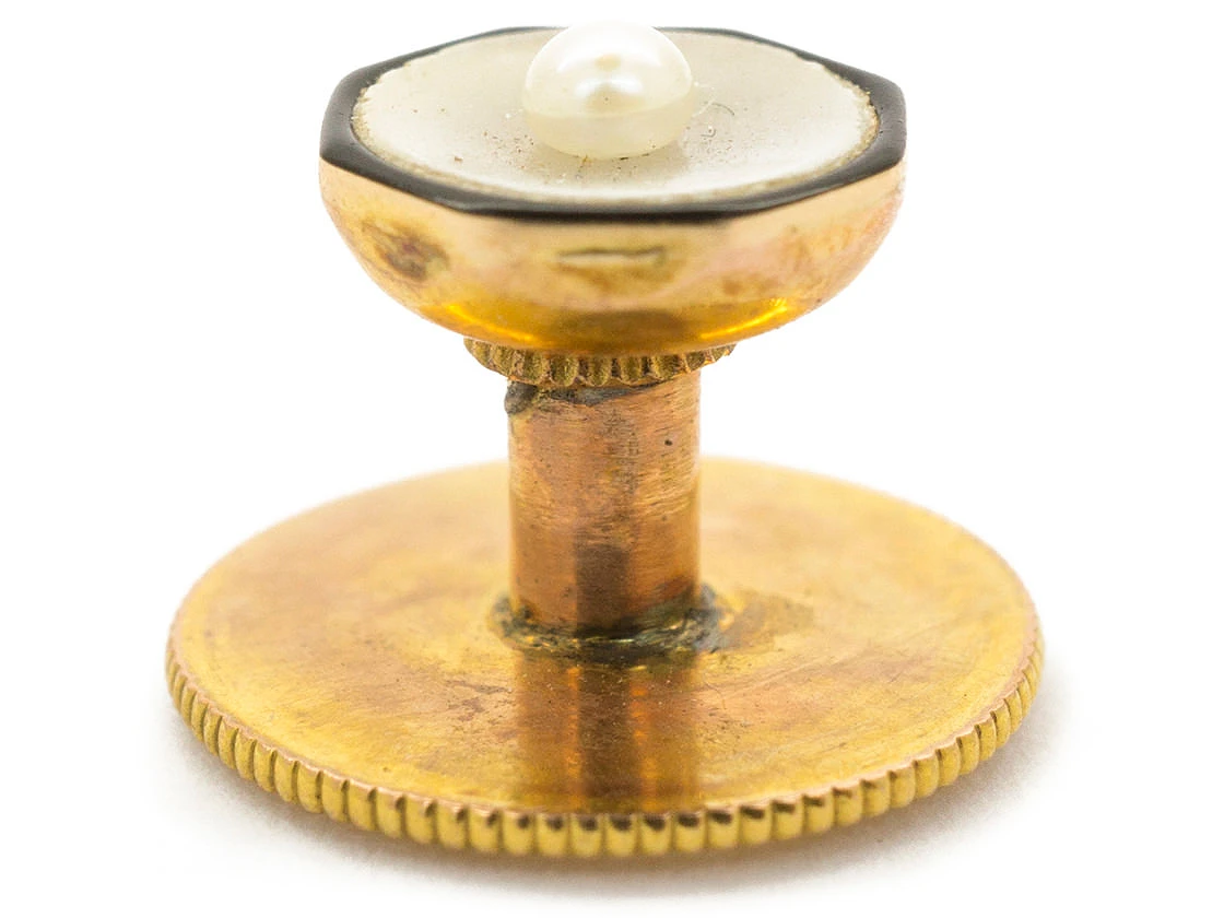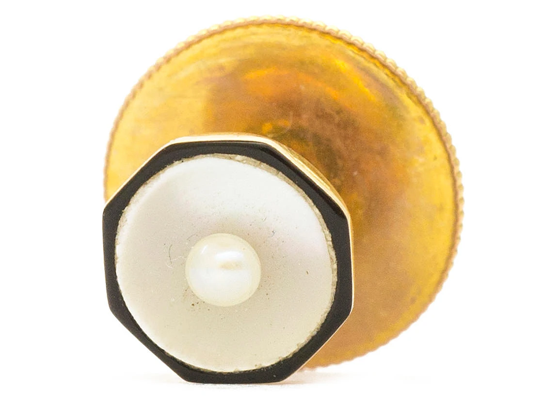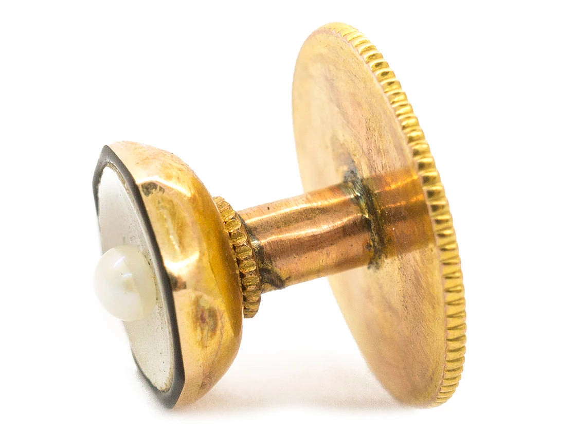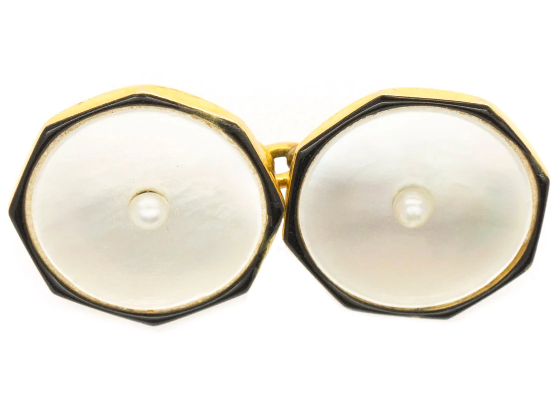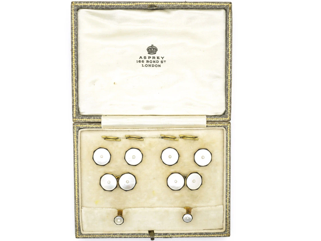 A smart 9ct37.5% pure gold (or 375 parts pure gold and 625 parts other metals) gold dress setA suite of gentleman’s jewellery used for formal occasions and usually includes cuff links, shirt studs, and vest values. containing cufflinks, four dress values and two collar studs. They are an attractive octagonal shape with round mother of pearlThe iridescent inner layer of certain molluscs such as oysters or abalones which is used as a decorative inlay. plaques set with naturalA natural stone is called such because it has not been subjected to any treatments. split pearls. Black enamelA pigmented glass-like material used in powdered form and fused onto the metal surface of a piece of jewellery. highlights the design. They were retailed by Asprey.