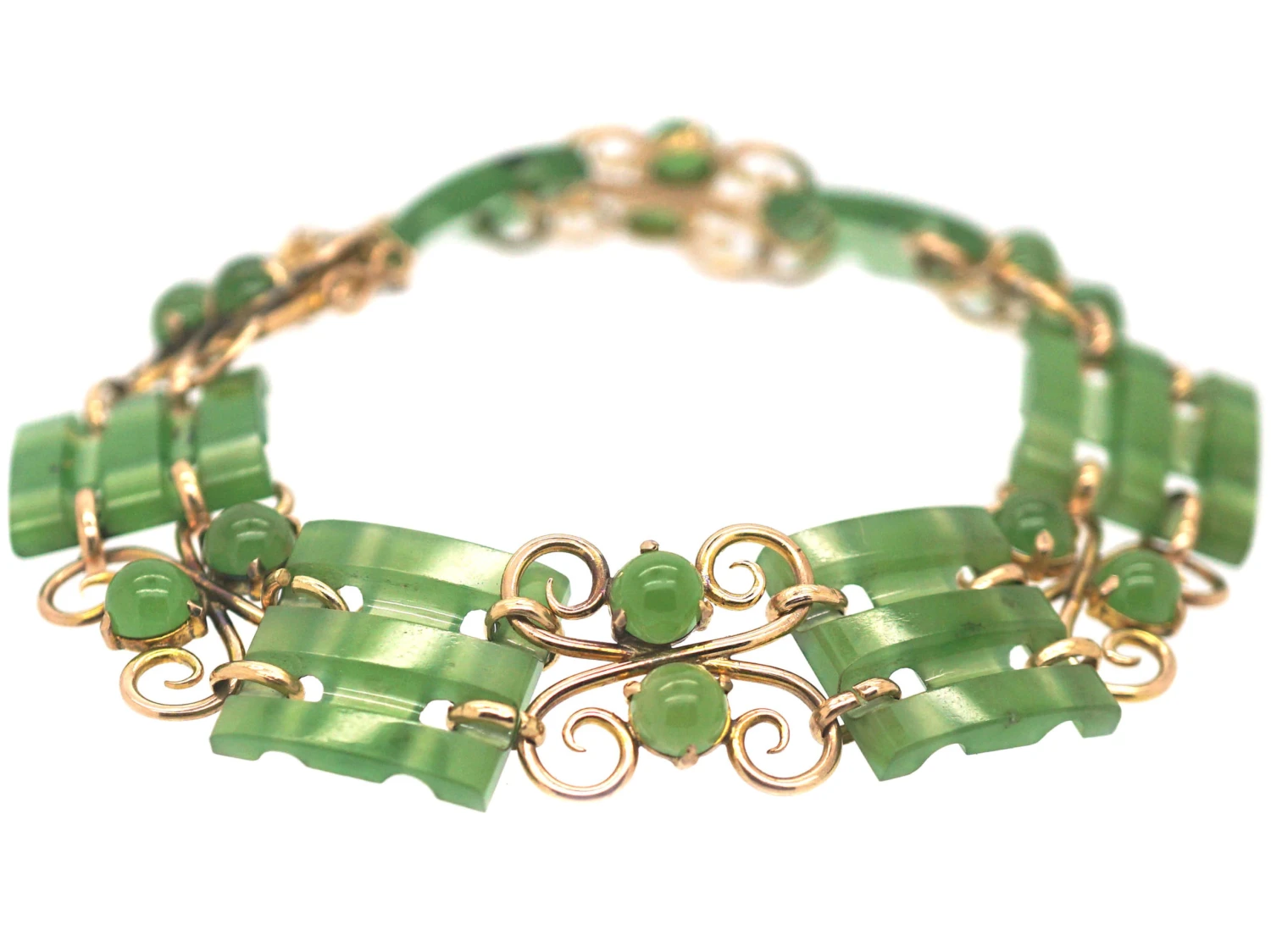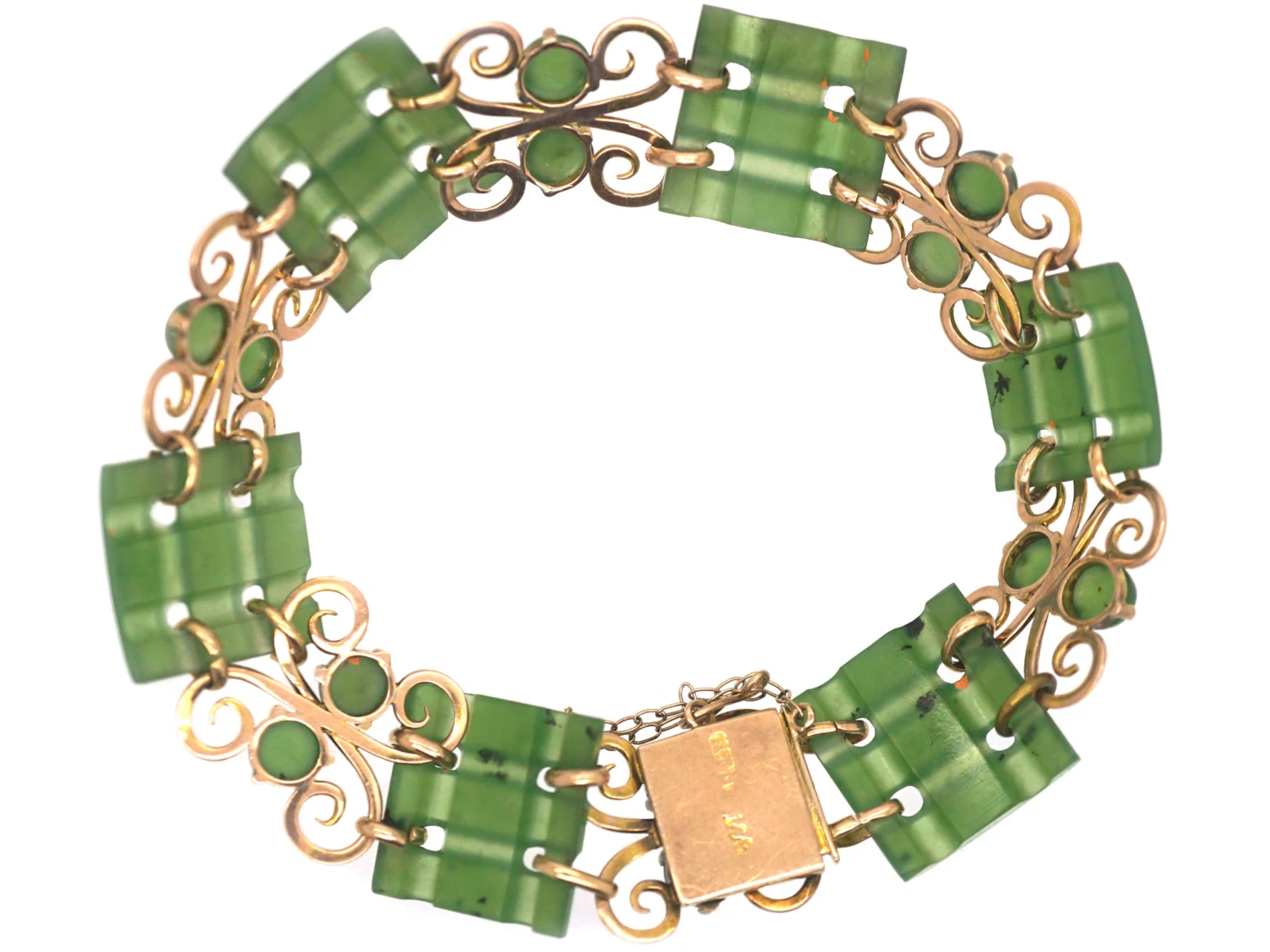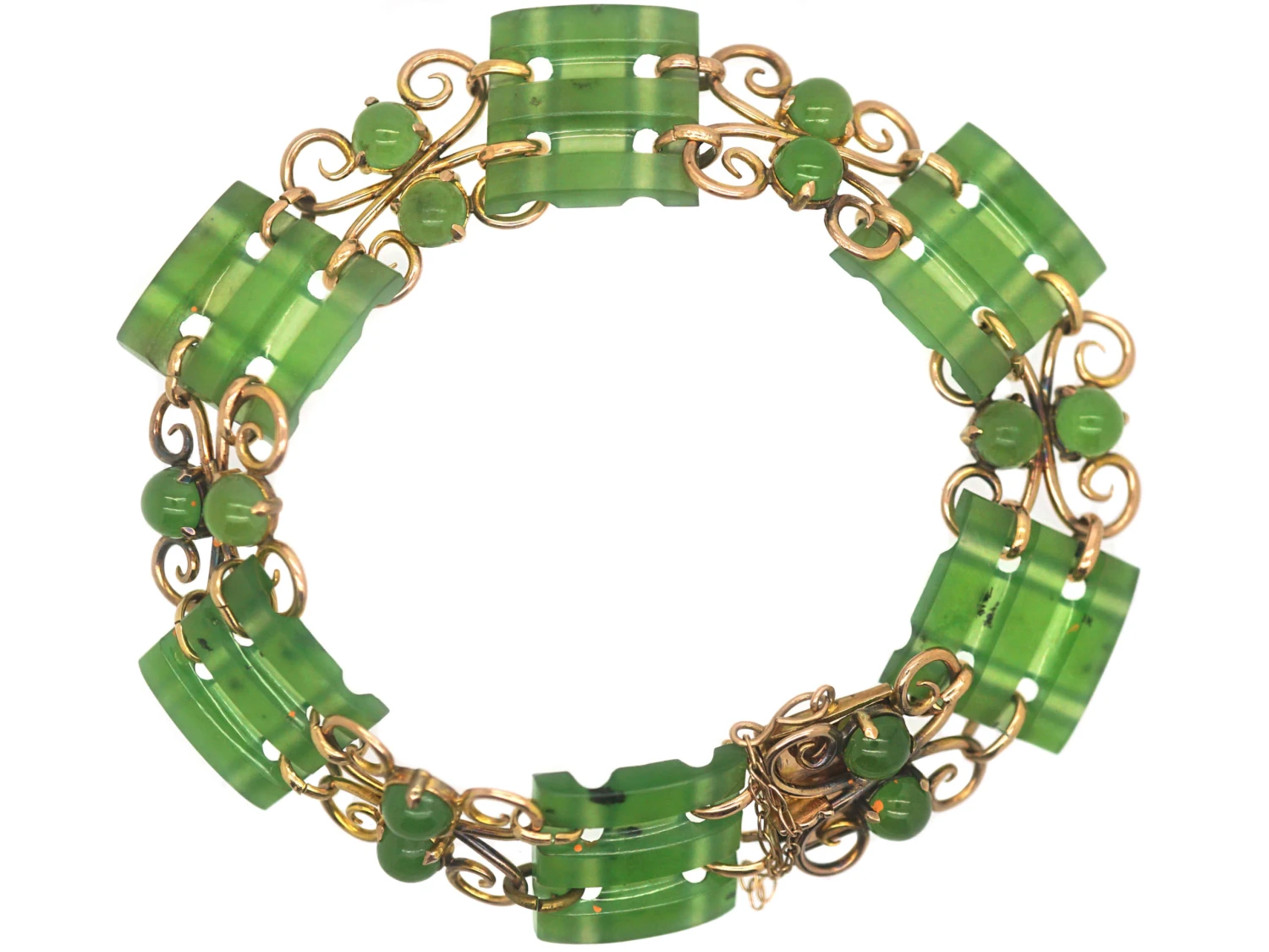 An attractive 9ct37.5% pure gold (or 375 parts pure gold and 625 parts other metals) gold bracelet that was made circa 1930. It is made up of six square cut pieces of nephrite which is a type of jadeA semi-precious stone that ranges in colour. Translucent jade is more highly valued than opaque jade. Jade is often cabochon cut. Stones with imperfections are usually carved. Two different minerals are known as jade: jadeite and nephrite. The Chinese have prized jade for thousands of years and regard it as having medicinal properties when worn or ingested a…. In between are two nephrite beads within a gold design. Nephrite jade is one of the oldest gemstones in the world and is a sacred material in Chinese cultures and traditions. For many centuries, people confused nephrite and jadeite as the same mineral, when in fact, they are very different chemically. It has a secure hidden clasp. it is a wonderful colour and looks very pretty when worn.