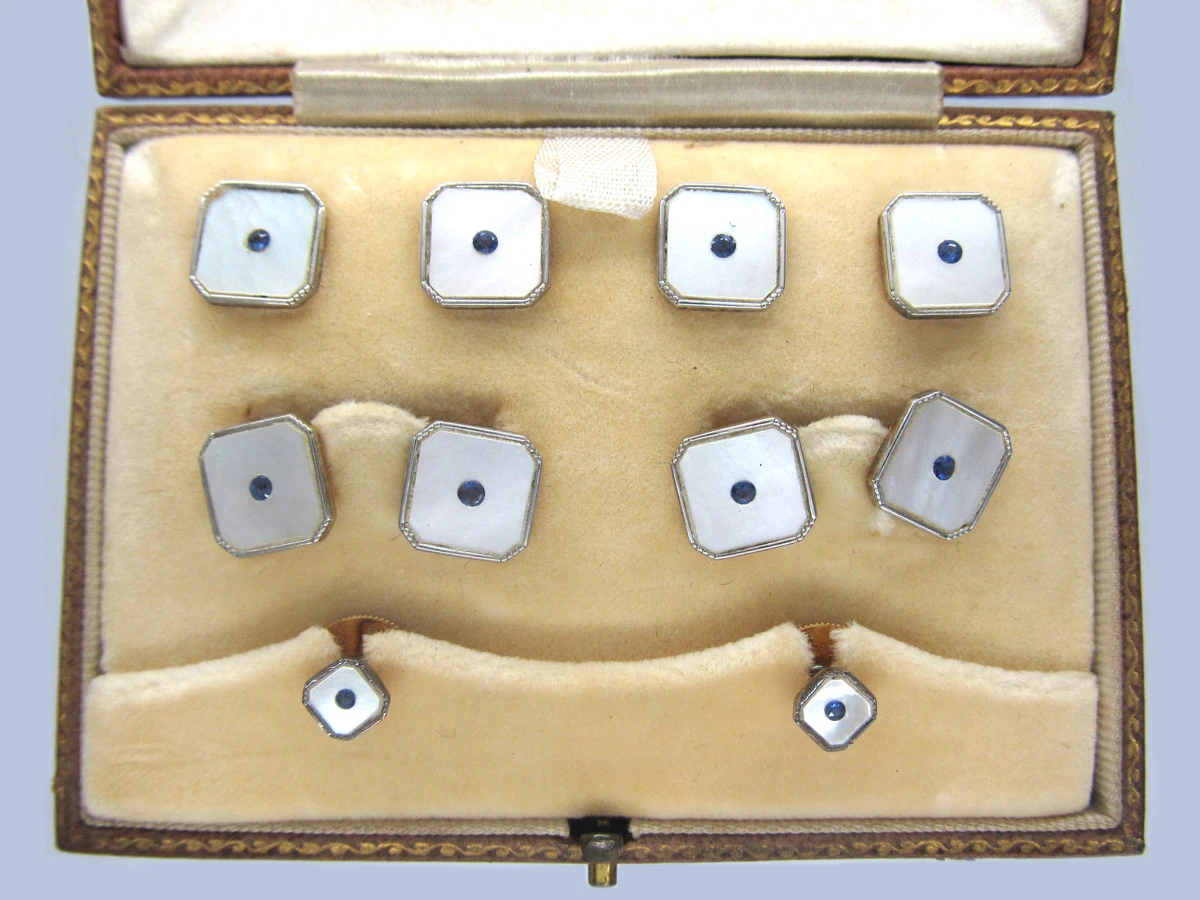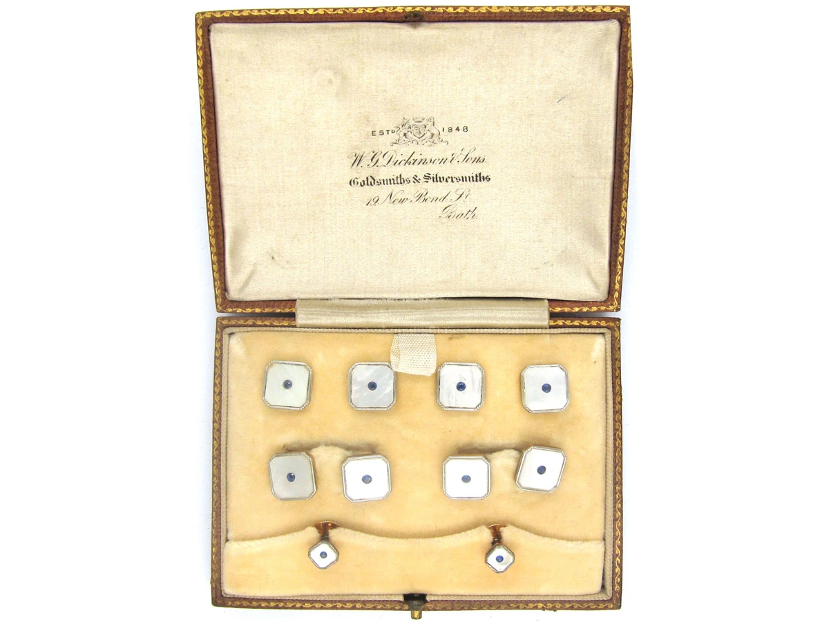 A well presented dress setA suite of gentleman’s jewellery used for formal occasions and usually includes cuff links, shirt studs, and vest values. which comprises cufflinks four values and two studs. It was made circa 1925 and is 9ct37.5% pure gold (or 375 parts pure gold and 625 parts other metals) two colour gold set with mother of pearlThe iridescent inner layer of certain molluscs such as oysters or abalones which is used as a decorative inlay. plaques set with sapphires.