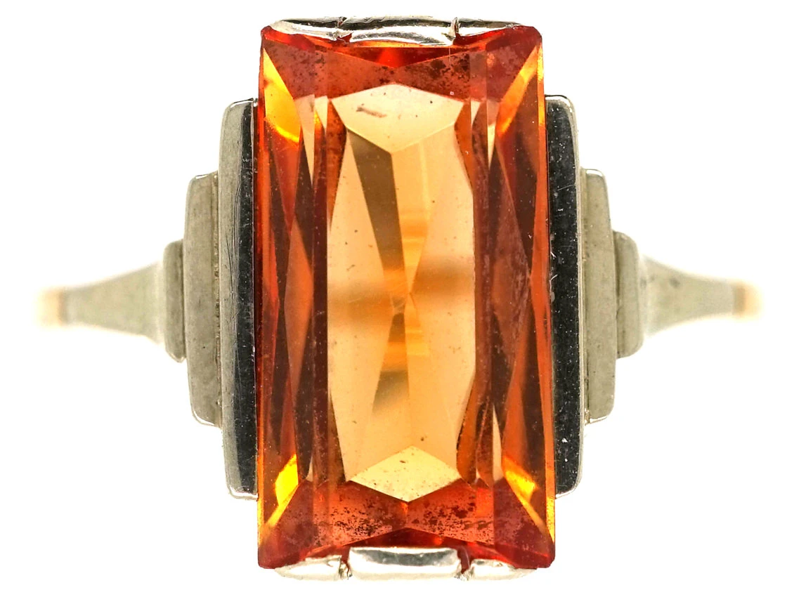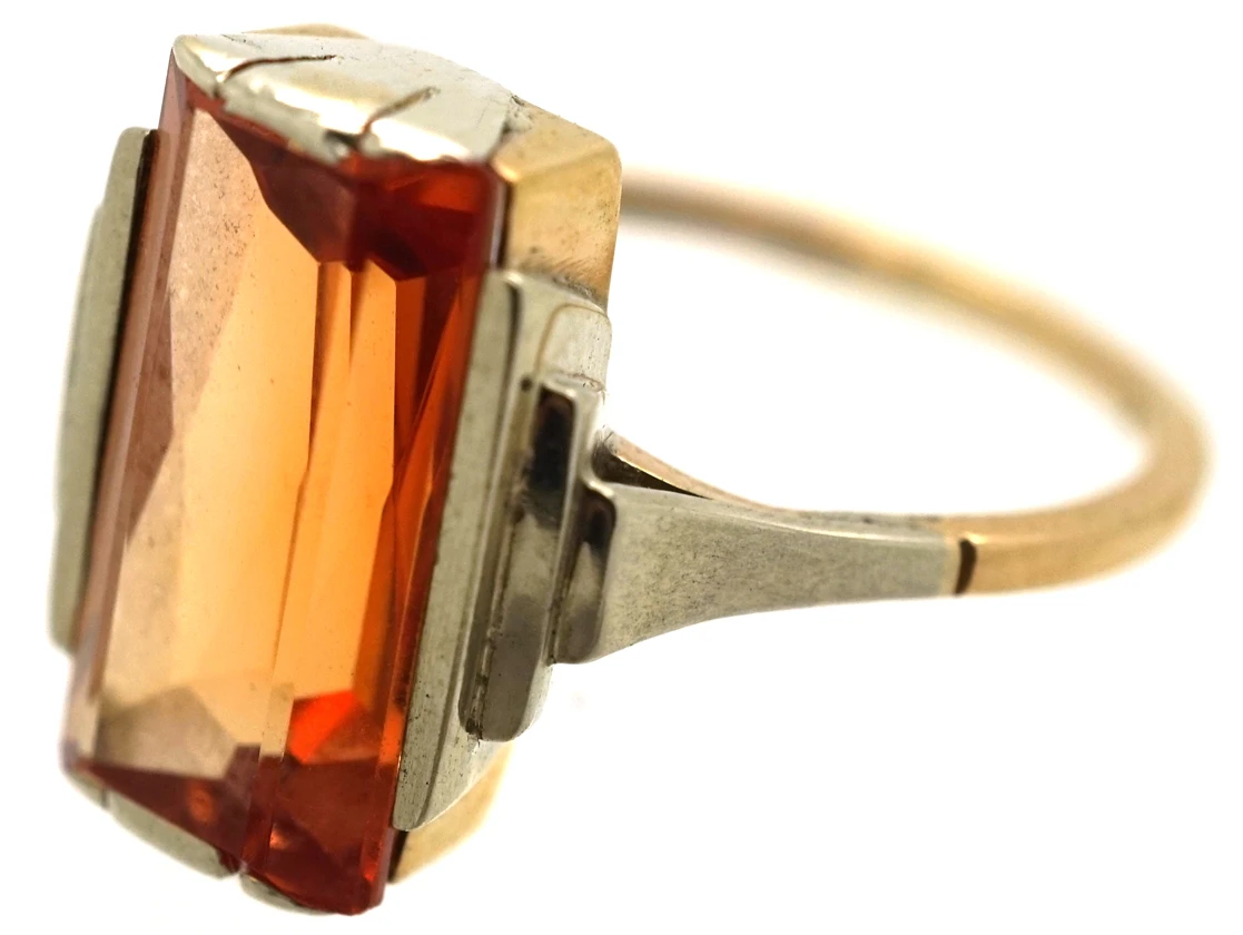A really stylish Art DecoA movement within the arts between the two Great Wars (1920-1935) across Europe and the US, characterized by its clean, geometric designs. The aesthetic was intended to celebrate an age of progress and the modernity of the machine. ring that was made in the 9120s. It is two colour 9ct37.5% pure gold (or 375 parts pure gold and 625 parts other metals) gold with white goldWhite gold is an alloy of gold and at least one other white metal – most often nickel or palladium (both of which act as a bleaching agent to reduce the natural yellow colour of the gold). around the citrineCitrine (from the French for âlemonâ) is a rare, yellow type of quartz, a semi-precious stone that ranges in colour from pale yellow to orange to golden brown. The best quality citrine is found in Brazil. in a step cutA step cut is a style of cutting a gemstone characterised by straight sides with parallel facets. Most often, step cut stones are square or rectangular. design to a yellow gold shankThe circle of metal that attaches to the decorative part of a ring and encircles the finger.. The Madeira citrine is a lovely pale orange colour and has been cut in a way that shows off the colours within the stone. It is a pretty and unusual ring.