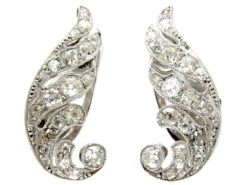 A lovely pair of 18ct75% pure gold (or 750 parts pure gold and 250 parts other metals) white goldWhite gold is an alloy of gold and at least one other white metal – most often nickel or palladium (both of which act as a bleaching agent to reduce the natural yellow colour of the gold). Art DecoA movement within the arts between the two Great Wars (1920-1935) across Europe and the US, characterized by its clean, geometric designs. The aesthetic was intended to celebrate an age of progress and the modernity of the machine. earrings which have been set with old mine cutAn 18th, 19th and early 20th century diamond shape, typically cushion or asymmetrical, marked by a small table, a high crown and a large culet. Culets are the small flat facets at the bottom of a stone which appear to the untrained eye as a hole in the middle of the stone. Before the advent of modern machinery which allows for the precise faceting we see tod… diamonds. They are in the form of wings and clip on up the ear. The effect is fabulous.