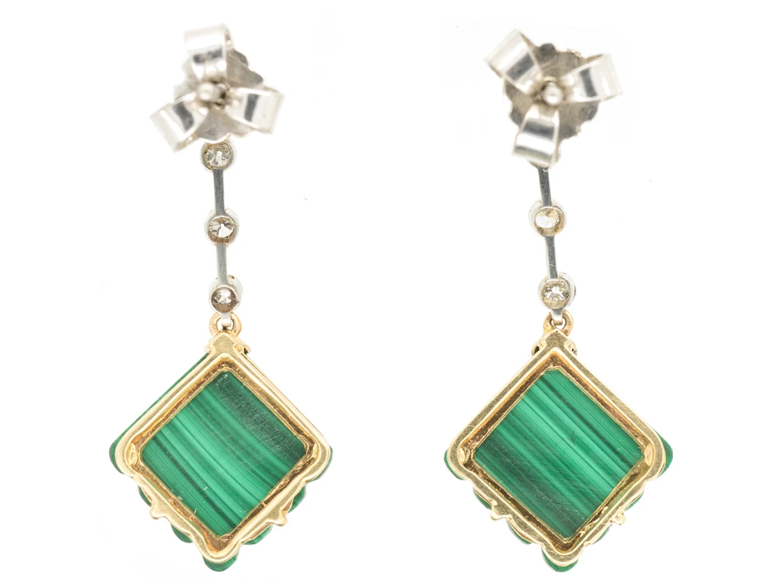 A striking pair of Art DecoA movement within the arts between the two Great Wars (1920-1935) across Europe and the US, characterized by its clean, geometric designs. The aesthetic was intended to celebrate an age of progress and the modernity of the machine. earrings set with white diamonds and carved fluted malachiteA dark green stone with bands of various shades of green. It is hydrated copper carbonate. squares. They look amazing on the ear.