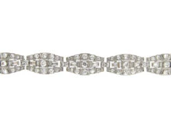 A beautiful diamondA precious, lustrous gemstone made of highly compressed carbon. Diamonds are one of the hardest materials known to mankind. Colours of diamonds range from colourless, yellow, orange and brown to almost black. Natural coloured (or ‘fancy’) diamonds can be extremely rare. The cut, colour, clarity and carat weight of a diamond are the criteria jewellers use… bracelet manufactured by the American firm Mcteigue & Co in the 1920s. It is a classic Art DecoA movement within the arts between the two Great Wars (1920-1935) across Europe and the US, characterized by its clean, geometric designs. The aesthetic was intended to celebrate an age of progress and the modernity of the machine. design and studded with white diamonds set in platinumDerives from the Spanish word ‘platina’ meaning ‘little silver’. Acknowledged since the 1900s, platinum’s durability and natural brightness has been and still is today highly treasured A metallic element prized for its rarity, whiteness, high tensile strength and insusceptibility to corrosion, platinum first became widely used in jewellery in the late ninete…. It is of exceptional quality and design.