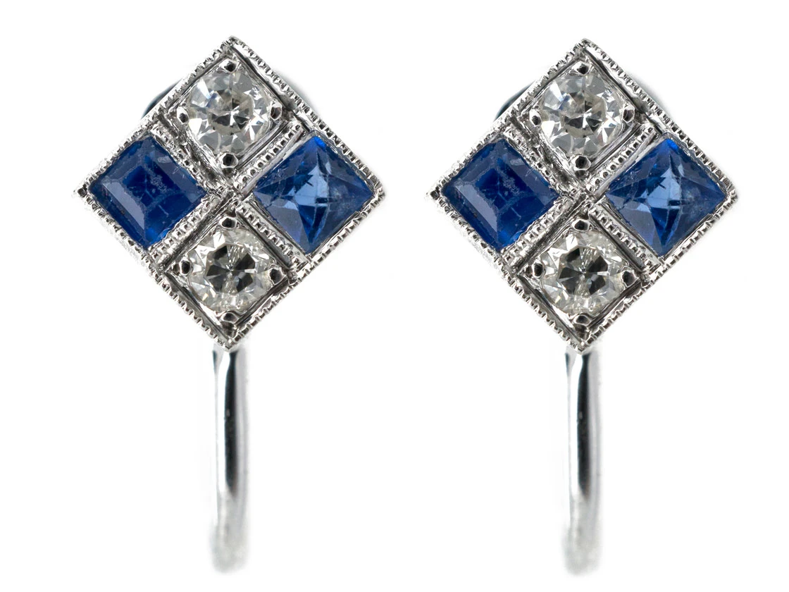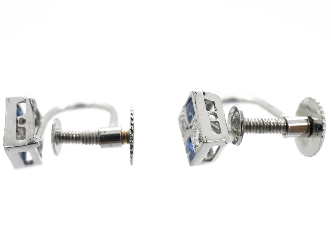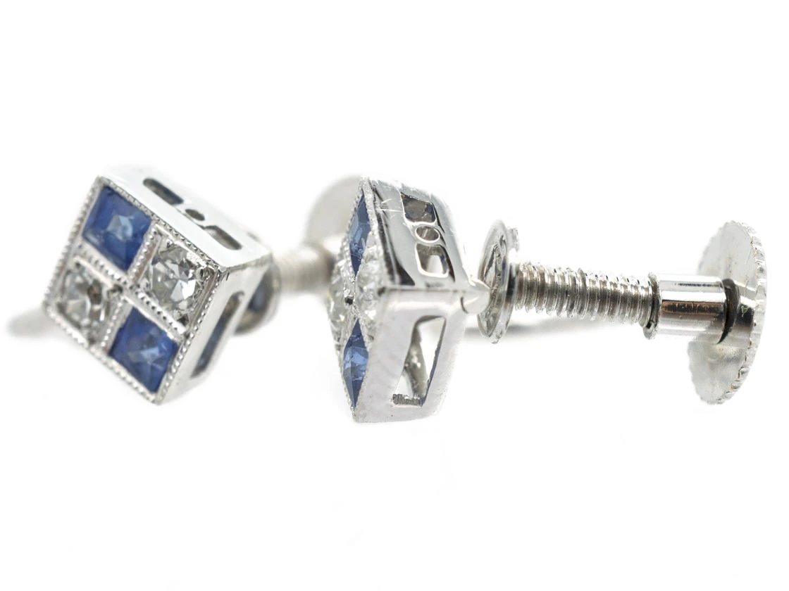A small pair of Art DecoA movement within the arts between the two Great Wars (1920-1935) across Europe and the US, characterized by its clean, geometric designs. The aesthetic was intended to celebrate an age of progress and the modernity of the machine. earrings. They are set with two sapphires and two diamonds in each one. The fittings are screws which can be changed to posts and scrolls.