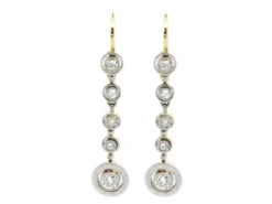 A lovely pair of diamondA precious, lustrous gemstone made of highly compressed carbon. Diamonds are one of the hardest materials known to mankind. Colours of diamonds range from colourless, yellow, orange and brown to almost black. Natural coloured (or ‘fancy’) diamonds can be extremely rare. The cut, colour, clarity and carat weight of a diamond are the criteria jewellers use… drop earrings. They have platinumDerives from the Spanish word ‘platina’ meaning ‘little silver’. Acknowledged since the 1900s, platinum’s durability and natural brightness has been and still is today highly treasured A metallic element prized for its rarity, whiteness, high tensile strength and insusceptibility to corrosion, platinum first became widely used in jewellery in the late ninete… fronts and 18ct75% pure gold (or 750 parts pure gold and 250 parts other metals) backs. This was common practice in the 1920s. The diamonds are very well matched and bright stones. The wires are very safe as they hinge back to open and forward to close.