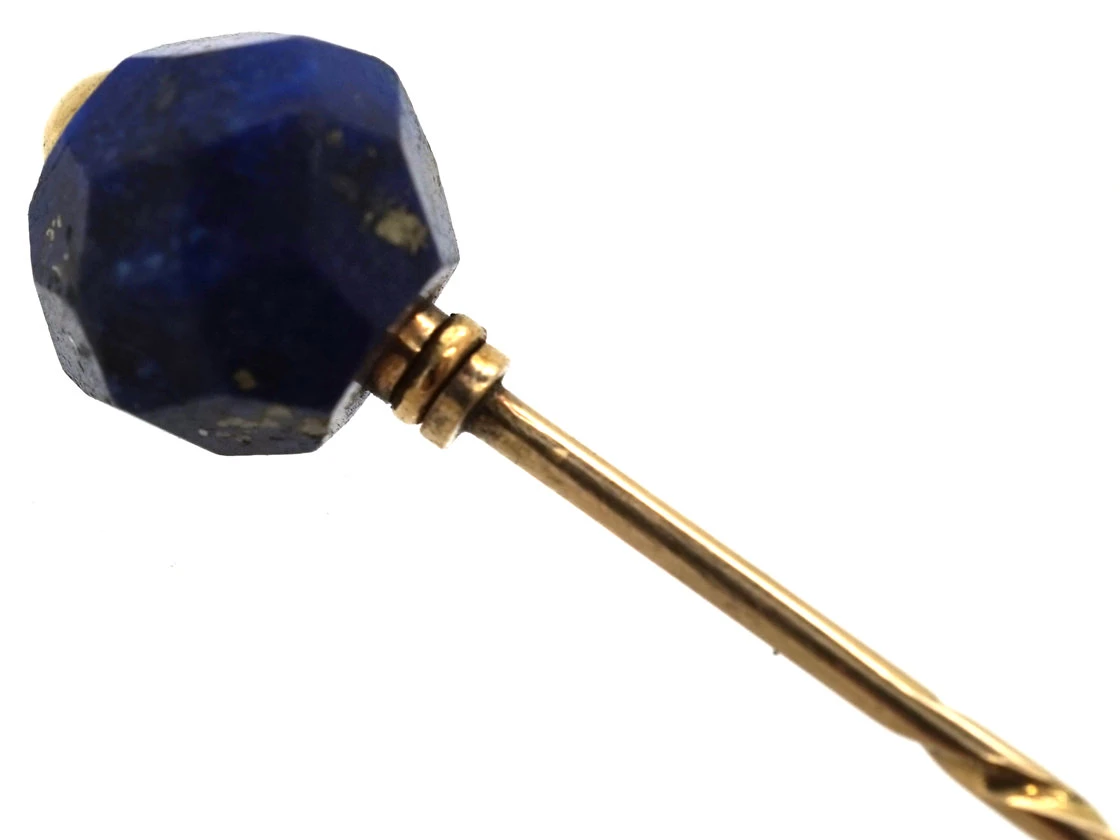 A smart tie pin with a facetedA faceted stone has small, flat-cut surfaces that make a sparkling effect on transparent stones. Facets act as both mirrors and windows. Reflecting light and channelling light into a stone where it refracts and re-emerges. lapis lazuliAn historically popular deep blue opaque gemstone. Lapis Lazuli is chiefly composed of the mineral Lazurite and is often flecked with gold Pyrite, giving each stone a unique mysticism. bead. It was made circa 1920-1930. An ideal gift to a future husband! All our tie pins come with a stopper at the end of the pin.