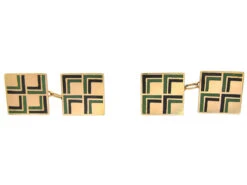 A good pair of 18ct75% pure gold (or 750 parts pure gold and 250 parts other metals) gold Art DecoA movement within the arts between the two Great Wars (1920-1935) across Europe and the US, characterized by its clean, geometric designs. The aesthetic was intended to celebrate an age of progress and the modernity of the machine. cufflinks that were made in the 1920s. They have a fantastic strong three dimensional design and have been enamelled in green and black enamelA pigmented glass-like material used in powdered form and fused onto the metal surface of a piece of jewellery.. At that time there was a complete reaction to the fussiness of the VictorianJewellery made in the the Victorian era (1839-1901). period followed by the flowing designs of the Art NouveauA movement within the arts, particularly jewellery, evolving out of a response to mass production and the industrial revolution (1890-1915). Jewellery of this period was heavily influenced by nature and femininity, with its sweeping lines and organic motifs. era. Simplicity in stark geometric form became the way forward and this style was echoed in the furniture, fabrics and architecture of the time.