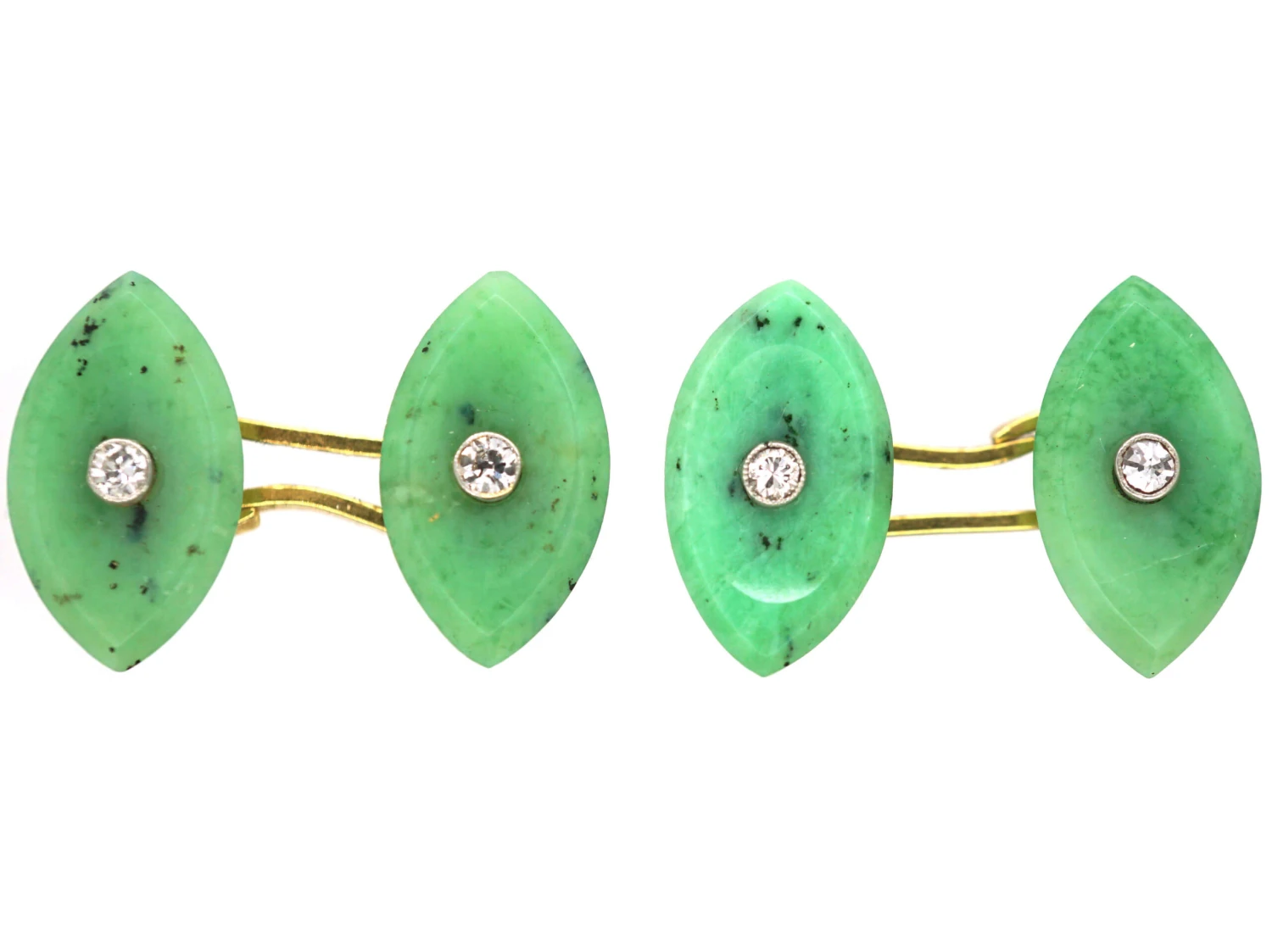A smart pair of 18ct75% pure gold (or 750 parts pure gold and 250 parts other metals) gold and jadeA semi-precious stone that ranges in colour. Translucent jade is more highly valued than opaque jade. Jade is often cabochon cut. Stones with imperfections are usually carved. Two different minerals are known as jade: jadeite and nephrite. The Chinese have prized jade for thousands of years and regard it as having medicinal properties when worn or ingested a… cufflinks that were made in the 1920s. They are typical of that period with their navetteAn oval or elliptical gemstone cut which has pointed ends. Also called a Marquise shape. shape and the use of the jade which was popular at that time. The 18ct gold fittings can be undone if wished when putting them on but it is not really necessary as they should fit through a value hole.