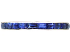 was made circa 1920. It has been set with beautiful well matched Royal blue sapphires that are interesting because they are not the normal baguetteFrench for ârod.â A type of rectangular step-cut comprising fourteen parallel, narrow facets running the length of the stone. Popular in mid-century eternity bands. cuts but are slightly domed which makes this ring rather unusual. They are within tramline settings that are a neat and smart look. We also have a rubyOne of the most valuable gemstones on earth. From the corundum family, the red variety being ruby and the blue, sapphire. With the exception of the diamond, corundum is the hardest of the gemstones on the Mohs scale scoring a 9. eternity ring in stock that matches this ring.