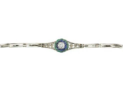 A beautiful Art DecoA movement within the arts between the two Great Wars (1920-1935) across Europe and the US, characterized by its clean, geometric designs. The aesthetic was intended to celebrate an age of progress and the modernity of the machine. platinumDerives from the Spanish word ‘platina’ meaning ‘little silver’. Acknowledged since the 1900s, platinum’s durability and natural brightness has been and still is today highly treasured A metallic element prized for its rarity, whiteness, high tensile strength and insusceptibility to corrosion, platinum first became widely used in jewellery in the late ninete… bracelet that was made in the 1920s. It has a central flower shaped clusterA group of small diamonds or colourful gemstones grouped together to form a cluster, mimicking the look of a larger gem. Often this group can surround a larger center stone. with a good bright white diamondA precious, lustrous gemstone made of highly compressed carbon. Diamonds are one of the hardest materials known to mankind. Colours of diamonds range from colourless, yellow, orange and brown to almost black. Natural coloured (or ‘fancy’) diamonds can be extremely rare. The cut, colour, clarity and carat weight of a diamond are the criteria jewellers use… in the middle. Around it at a lower level are sapphires in millgrained scalloped settings and around them slightly lower again are baguetteFrench for “rod.” A type of rectangular step-cut comprising fourteen parallel, narrow facets running the length of the stone. Popular in mid-century eternity bands. cut emeralds. On either side are small leaves set with tiny rose diamonds. The catch is secure with a clip over fitting and a safety chainA small chain applied to a piece of jewellery with the purpose of adding additional security to prevent loss. On bracelets and necklaces a safety chain will often join the clasp ends should the clasp fail. On a brooch it is often attached to a small pin which is to be used in tandem with the main brooch pin..