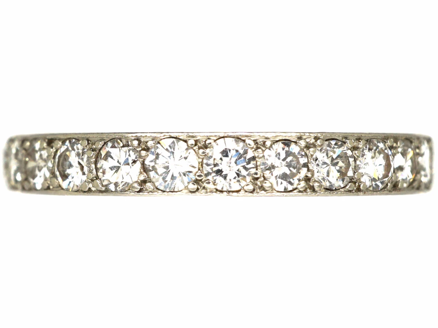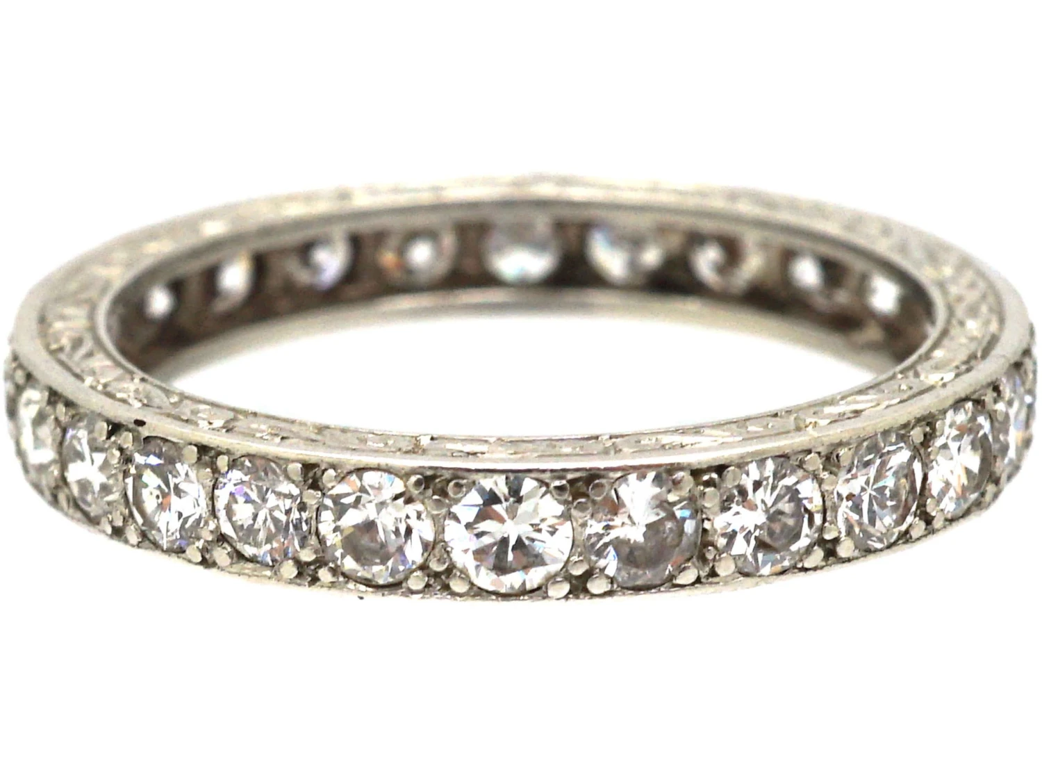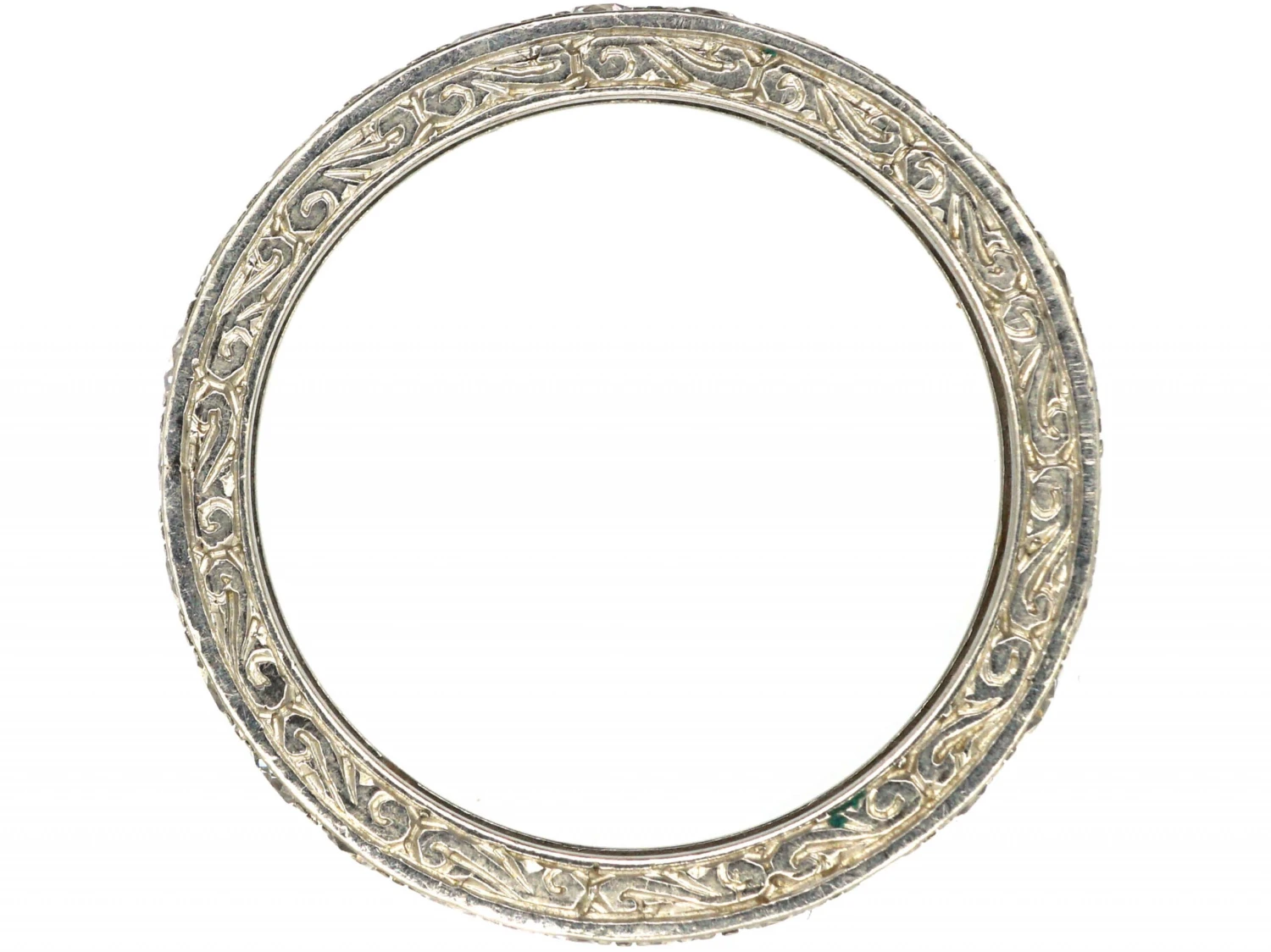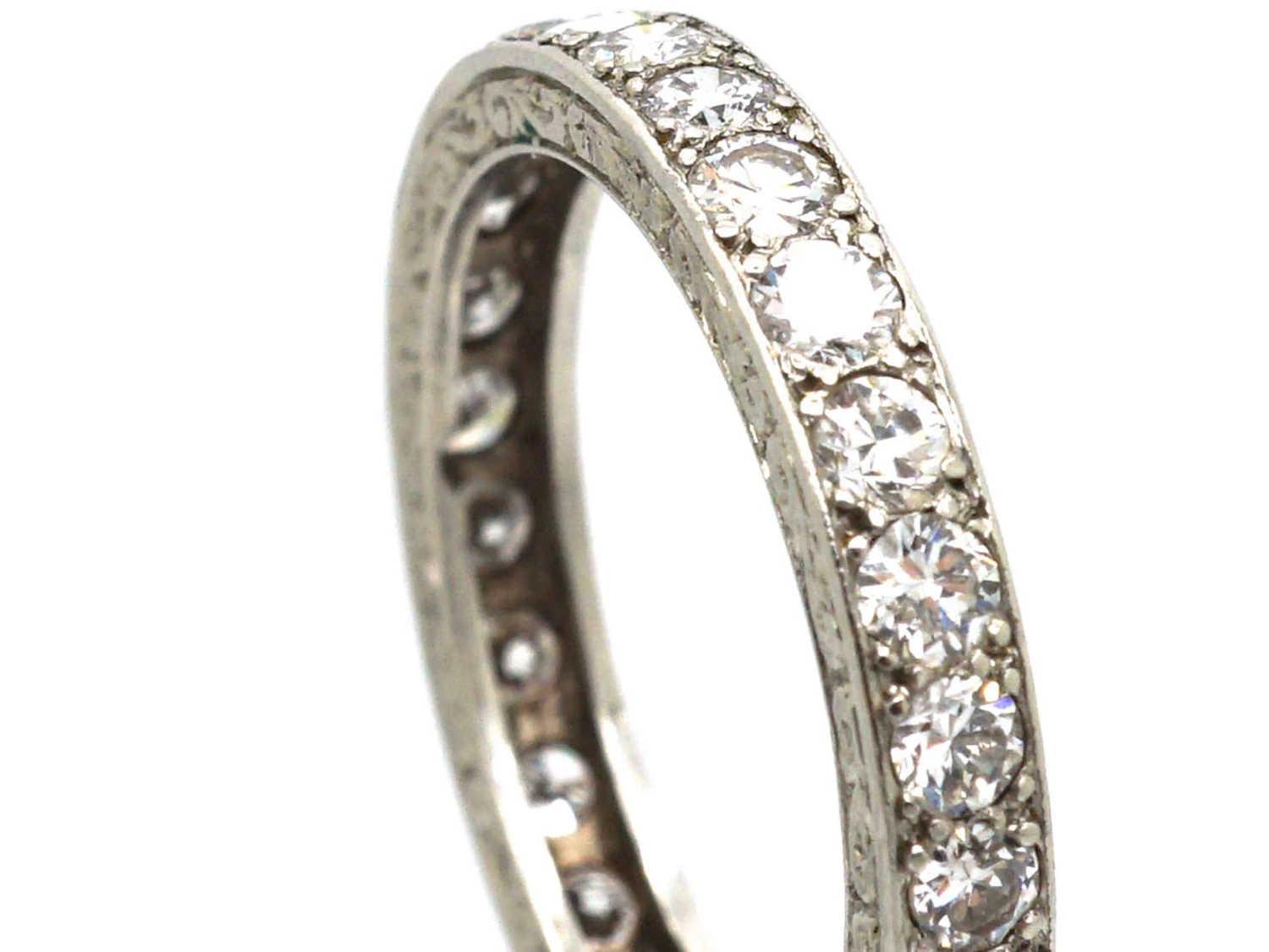 that has been set with 1.30 caratsThe unit of weight for a diamond or other gemstone and also for a pearl. Abbreviated ‘ct’, 1 carat is equal to 0.2 grams. In reference to gold, a unit of purity or fineness of gold and gold alloy, expressed as a number out of 24 parts by weight, e.g. ’24 carat’ signifies pure gold, ’18 carat’ 18/24th gold in the alloy, et cetera. Also abbreviated as ‘c… of well matched good white diamonds. It has pretty incised scroll decoration around both edges. It was made in the 1920s. This style of ring can either be worn on its own or with other similar rings in a stack. This ring cannot be sized.