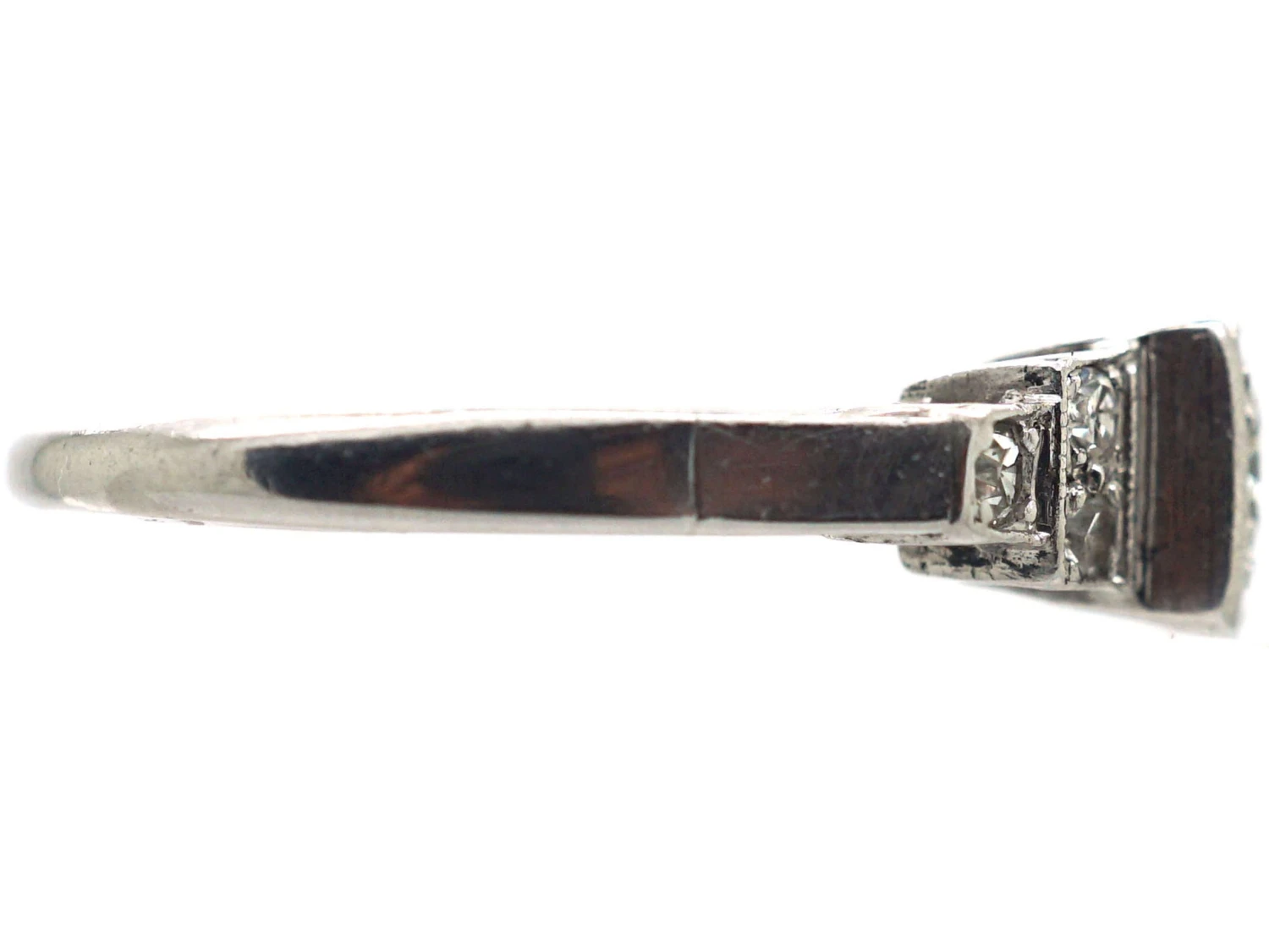 A good looking platinumDerives from the Spanish word ‘platina’ meaning ‘little silver’. Acknowledged since the 1900s, platinum’s durability and natural brightness has been and still is today highly treasured A metallic element prized for its rarity, whiteness, high tensile strength and insusceptibility to corrosion, platinum first became widely used in jewellery in the late ninete… ring that is typical of the Art DecoA movement within the arts between the two Great Wars (1920-1935) across Europe and the US, characterized by its clean, geometric designs. The aesthetic was intended to celebrate an age of progress and the modernity of the machine. period. It is a geometric design with a central diamondA precious, lustrous gemstone made of highly compressed carbon. Diamonds are one of the hardest materials known to mankind. Colours of diamonds range from colourless, yellow, orange and brown to almost black. Natural coloured (or ‘fancy’) diamonds can be extremely rare. The cut, colour, clarity and carat weight of a diamond are the criteria jewellers use… that has been set in a square setting, then there are step cutA step cut is a style of cutting a gemstone characterised by straight sides with parallel facets. Most often, step cut stones are square or rectangular. shouldersThe point on a ring where the central section meets the shank or band, often carved, decorated or inlaid with small diamond accent stones. set with small diamonds. It is a well balanced design and would make a perfect engagement ring