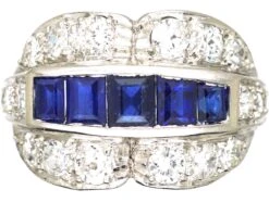 An unusual platinumDerives from the Spanish word ‘platina’ meaning ‘little silver’. Acknowledged since the 1900s, platinum’s durability and natural brightness has been and still is today highly treasured A metallic element prized for its rarity, whiteness, high tensile strength and insusceptibility to corrosion, platinum first became widely used in jewellery in the late ninete… ring in the form of a stylised double buckle. We have seen many variations on the buckle design over the years and this lovely ring is yet another version. The two sides are joined by a curved line of graduated calibre sapphires within tramline settings. The sapphires are a beautiful petrol blue colour. On either side are graduated diamonds. It is a terrific look when worn.