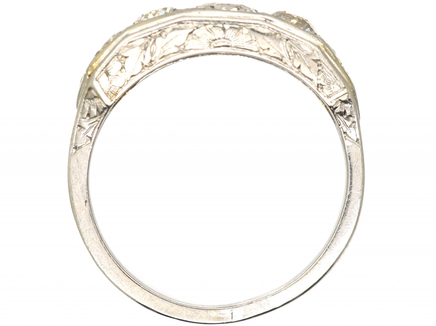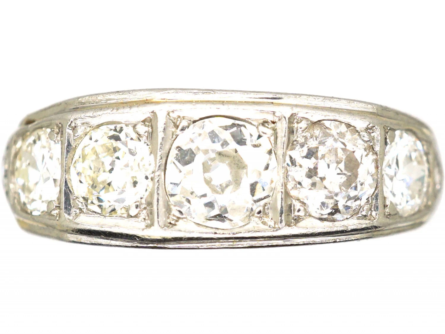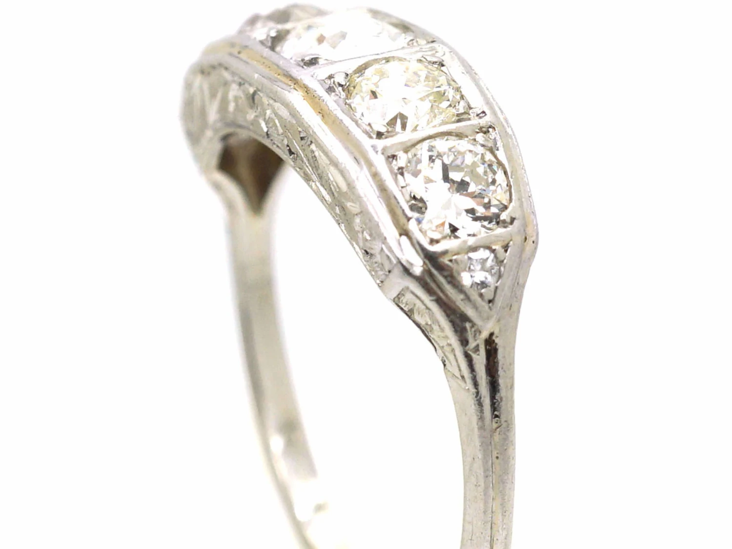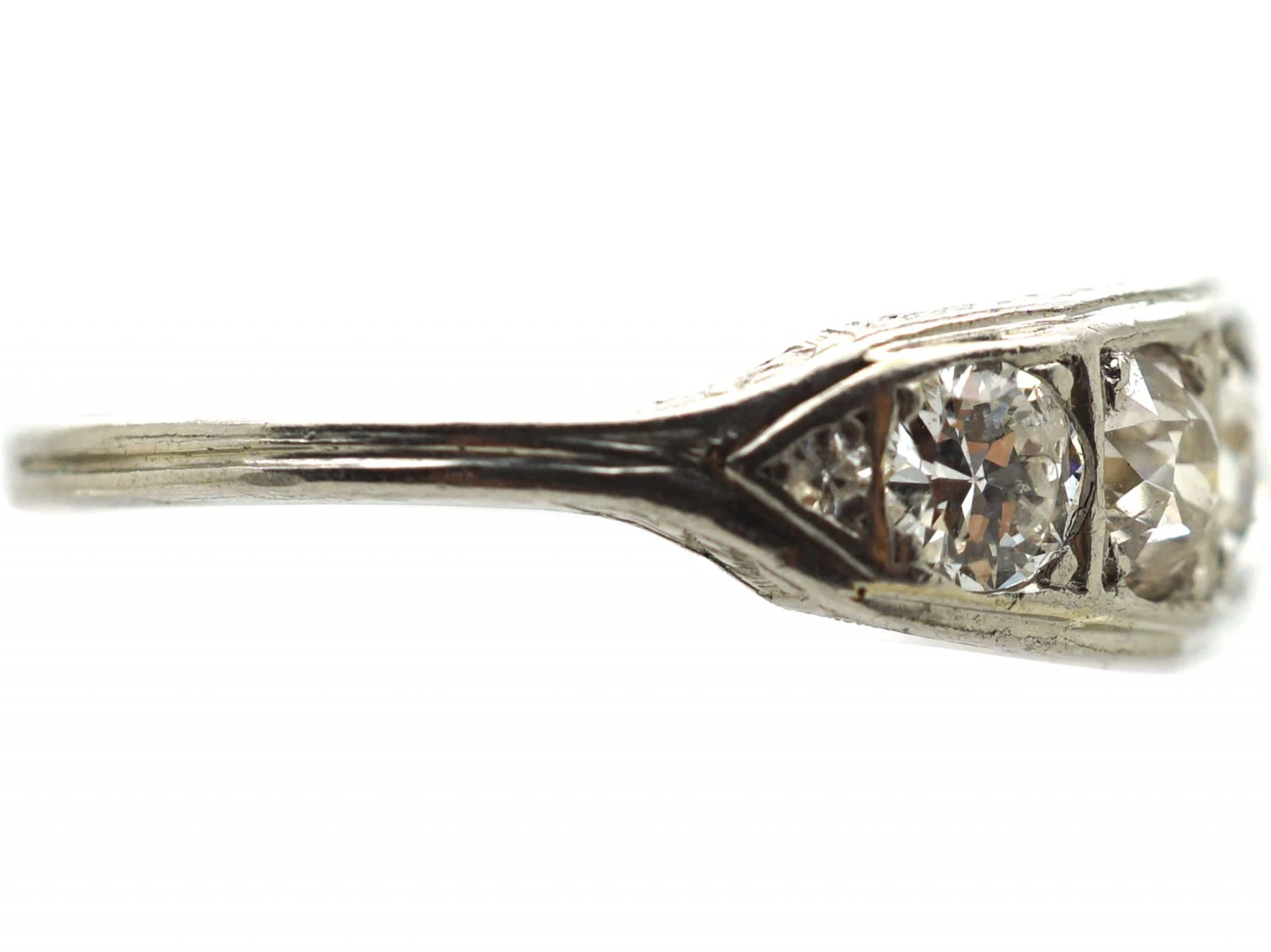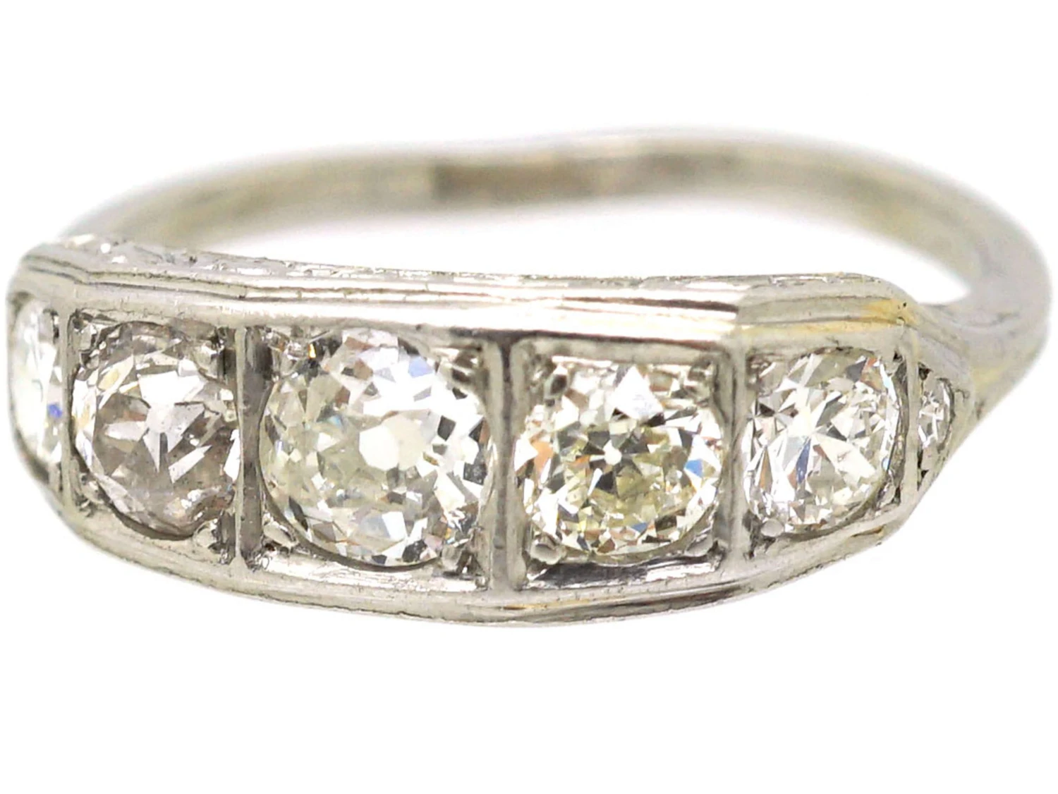 An unusual five stone diamondA precious, lustrous gemstone made of highly compressed carbon. Diamonds are one of the hardest materials known to mankind. Colours of diamonds range from colourless, yellow, orange and brown to almost black. Natural coloured (or âfancyâ) diamonds can be extremely rare. The cut, colour, clarity and carat weight of a diamond are the criteria jewellers use… ring that is typical of the Art DecoA movement within the arts between the two Great Wars (1920-1935) across Europe and the US, characterized by its clean, geometric designs. The aesthetic was intended to celebrate an age of progress and the modernity of the machine. era. It is made from platinumDerives from the Spanish word ‘platina’ meaning ‘little silver’. Acknowledged since the 1900s, platinum’s durability and natural brightness has been and still is today highly treasured A metallic element prized for its rarity, whiteness, high tensile strength and insusceptibility to corrosion, platinum first became widely used in jewellery in the late ninete… and has been set with five well matched bright white old European cutGemstones cut in this style have a smaller table than the round brilliant and the overall depth is greater. This style of cutting was popular in the 19th Century and is the direct predecessor to the modern round Brilliant Cut. Similar to the Old Mine Cut. diamonds with a total approximate weight of 1.10 caratsThe unit of weight for a diamond or other gemstone and also for a pearl. Abbreviated ‘ct’, 1 carat is equal to 0.2 grams. In reference to gold, a unit of purity or fineness of gold and gold alloy, expressed as a number out of 24 parts by weight, e.g. ’24 carat’ signifies pure gold, ’18 carat’ 18/24th gold in the alloy, et cetera. Also abbreviated as ‘c…. At either end are two small diamonds in triangular settings. The diamonds are held low down in secure settings so the ring is suited to everyday wear. It has been engraved on both sides with the traditional leaf and orange blossom design which was a motif meaning prosperity, innocence and virtue. The shankThe circle of metal that attaches to the decorative part of a ring and encircles the finger. features a reeded design. An ideal engagement ring.