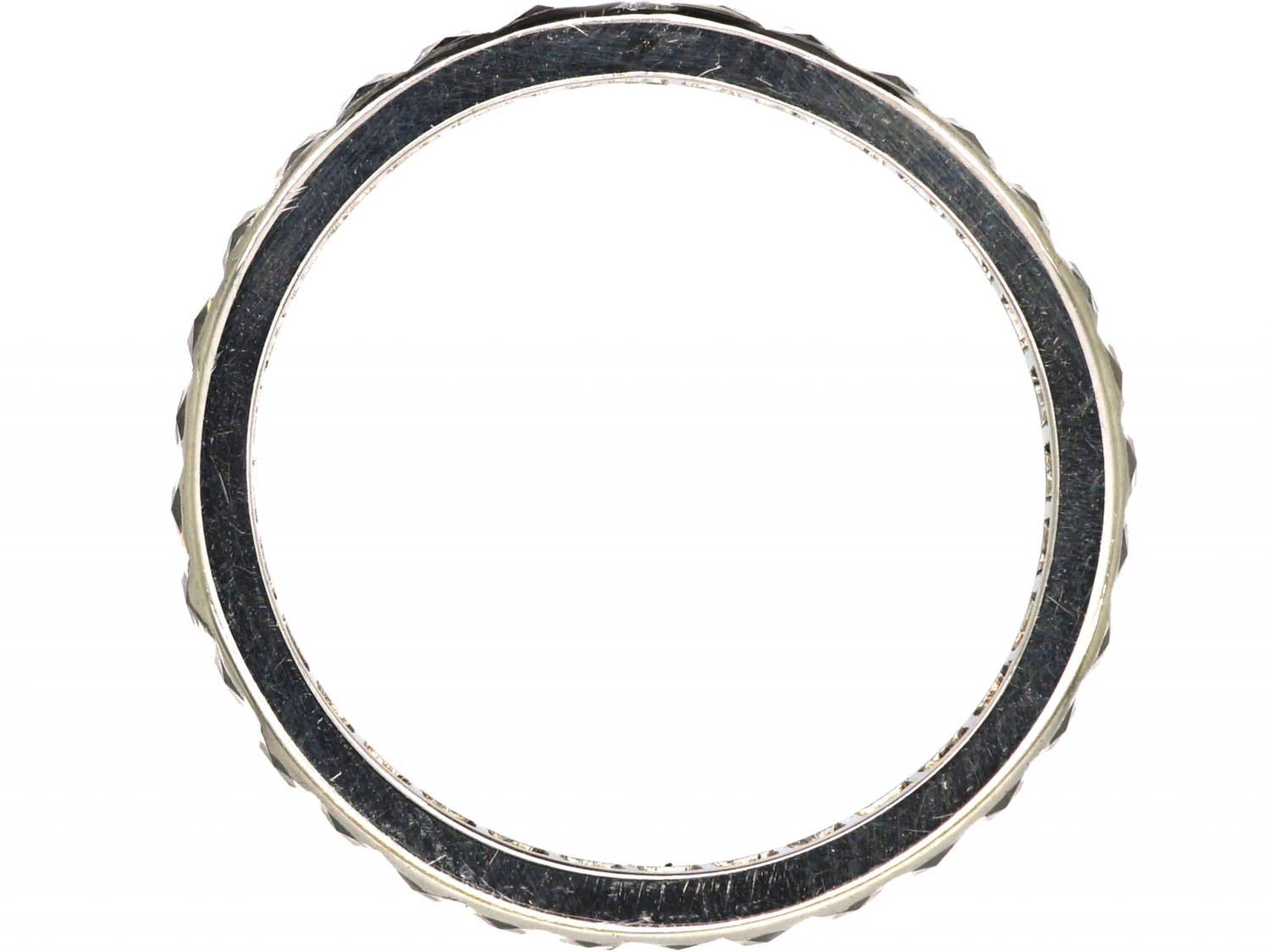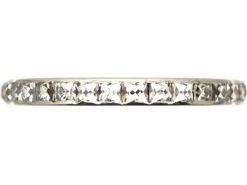 An unusual narrow platinumDerives from the Spanish word ‘platina’ meaning ‘little silver’. Acknowledged since the 1900s, platinum’s durability and natural brightness has been and still is today highly treasured A metallic element prized for its rarity, whiteness, high tensile strength and insusceptibility to corrosion, platinum first became widely used in jewellery in the late ninete… eternity ringA ring given as a symbol of lasting affection, typically set with an unbroken circle of gems.
