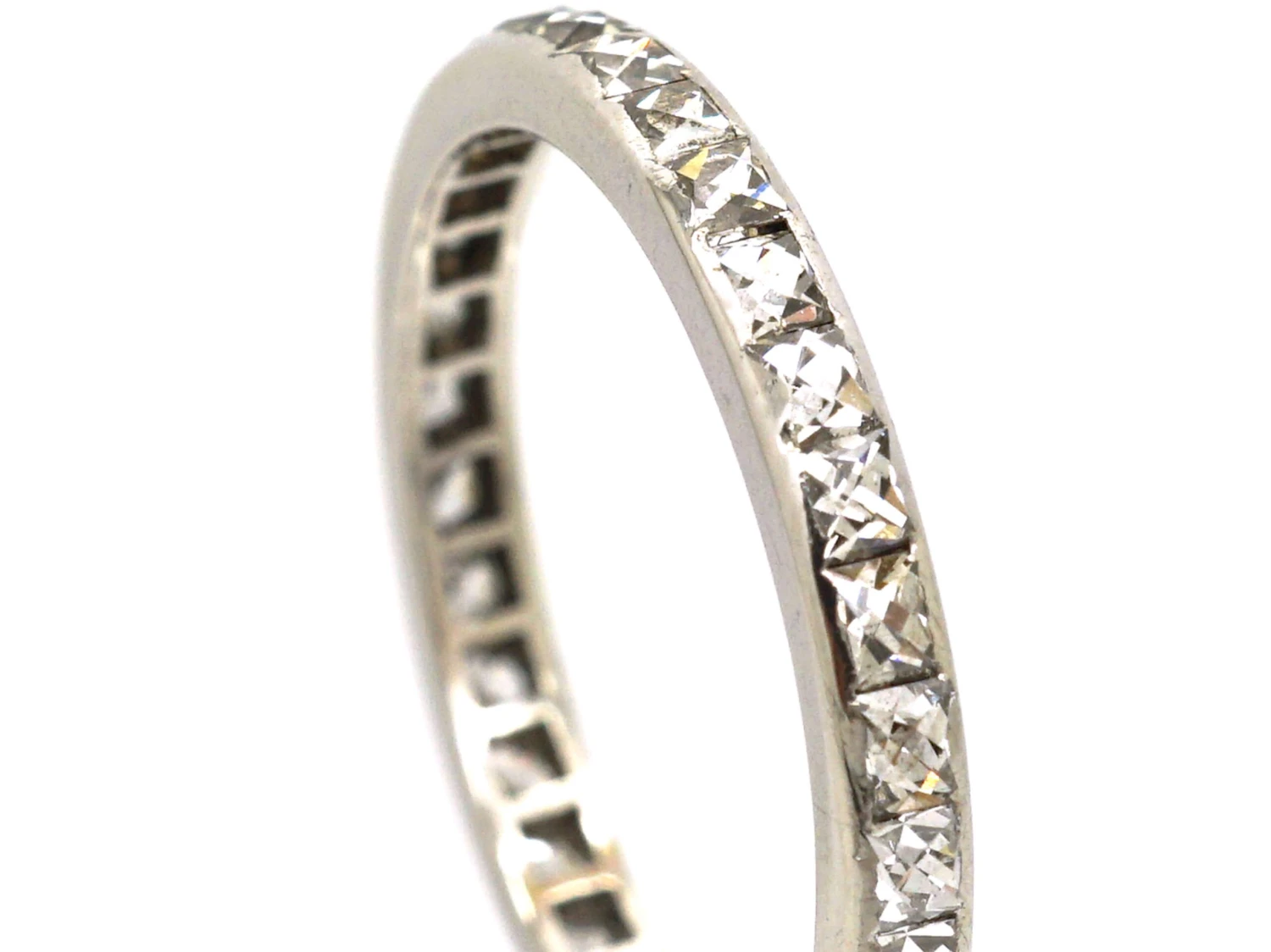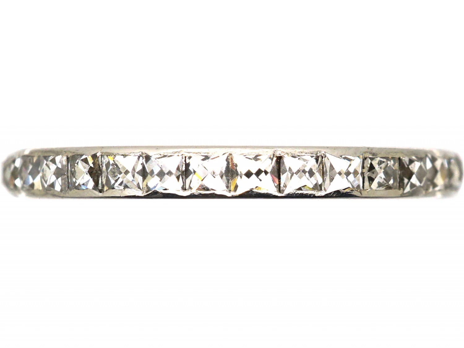 that has been set with French cut diamonds. These diamonds appear square from the face-up, with a criss cross pattern of triangular shaped facets. Perfect worn on its own or stacked with other bands. Please note that this ring cannot be sized.
