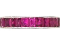 A fabulous Art Deco ruby and platinum full eternity ring that was made circa 1920-1935. It has been set with 27 French cut square cut rubies that are kept in place by open back tramline settings. The thin slithers of white metal contrast nicely with the bold red gemstones and there is millegrain detail along the edges. There is further engraving on either side of the band. This ring is typical of the Art Deco period and would look great worn on its own or stacked with other eternity bands. It is a size M and cannot be sized.