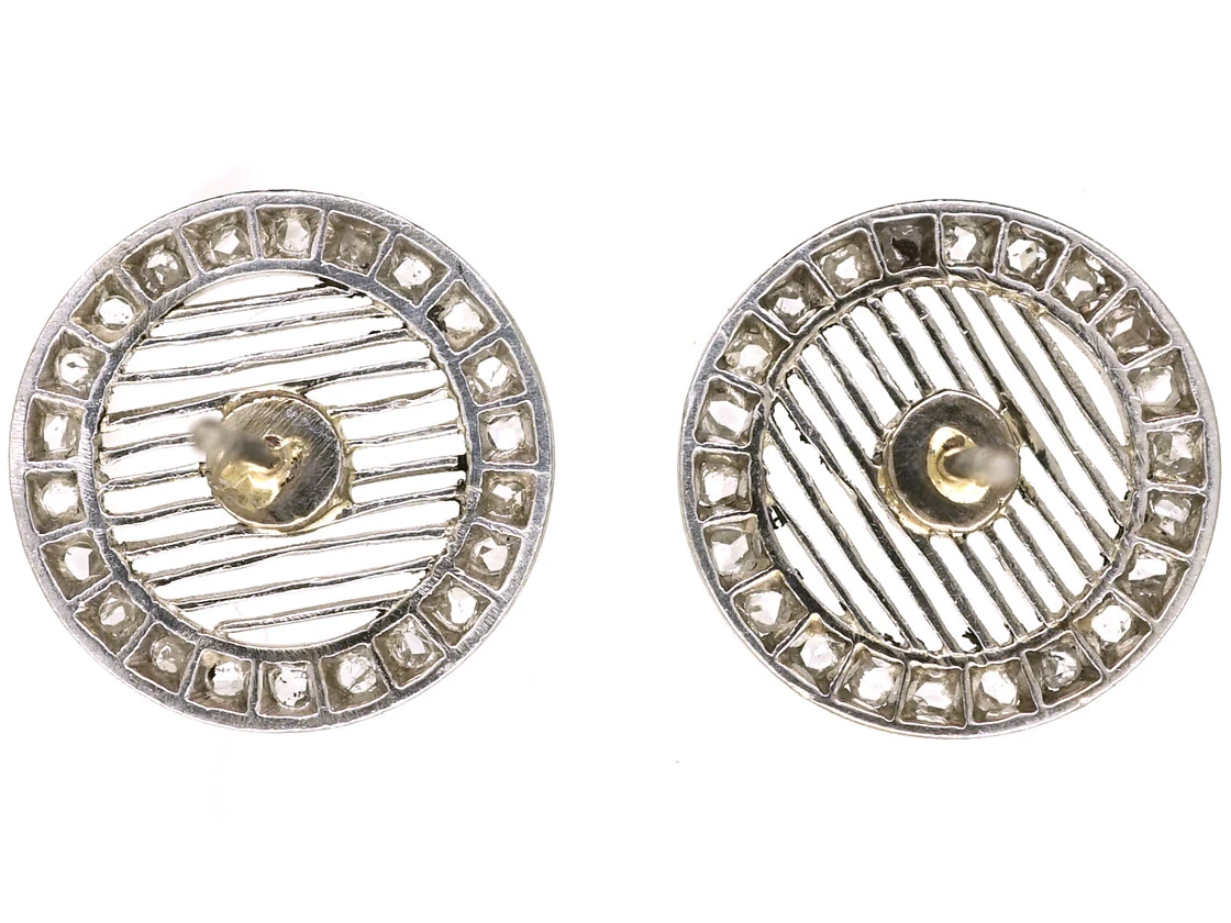 A smart pair of circular platinumDerives from the Spanish word ‘platina’ meaning ‘little silver’. Acknowledged since the 1900s, platinum’s durability and natural brightness has been and still is today highly treasured A metallic element prized for its rarity, whiteness, high tensile strength and insusceptibility to corrosion, platinum first became widely used in jewellery in the late ninete… earrings that were made circa 1920. They are set with one transition cutDirect descendants of the Old European Cut, this progressive cuts saw an evolution toward a larger table, a lower crown, and a smaller culet than previous cuts. However, unlike later brilliants, the girdles of these stones remained unfaceted. Considered a precursor to both the Modern Round Brilliant and the Ideal cuts. diamondA precious, lustrous gemstone made of highly compressed carbon. Diamonds are one of the hardest materials known to mankind. Colours of diamonds range from colourless, yellow, orange and brown to almost black. Natural coloured (or ‘fancy’) diamonds can be extremely rare. The cut, colour, clarity and carat weight of a diamond are the criteria jewellers use… in the middle and small rose cutThe ‘rose cut’, defined by its rounded outline and multiple triangular facets, is one of the earliest diamond cuts, with its origins in sixteenth century Europe. A rose cut typically has a flat base and anywhere from six to twenty four facets, the latter known as a full rose cut. diamonds around the edge. The lines of platinum give the earrings a light and pretty look.