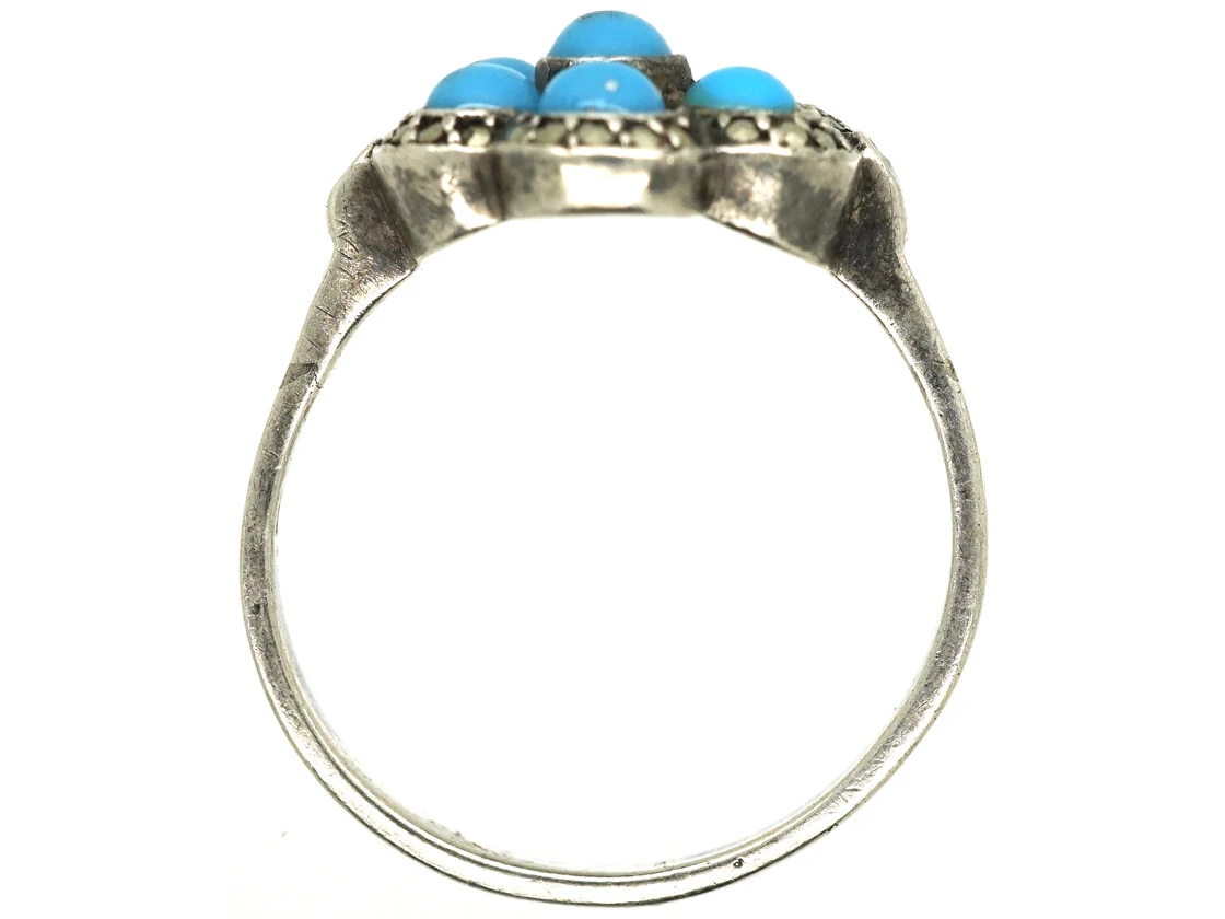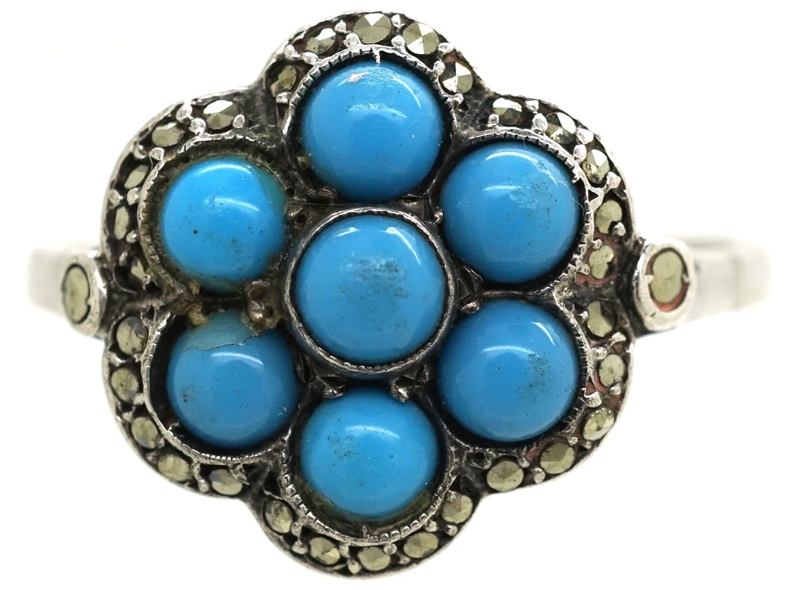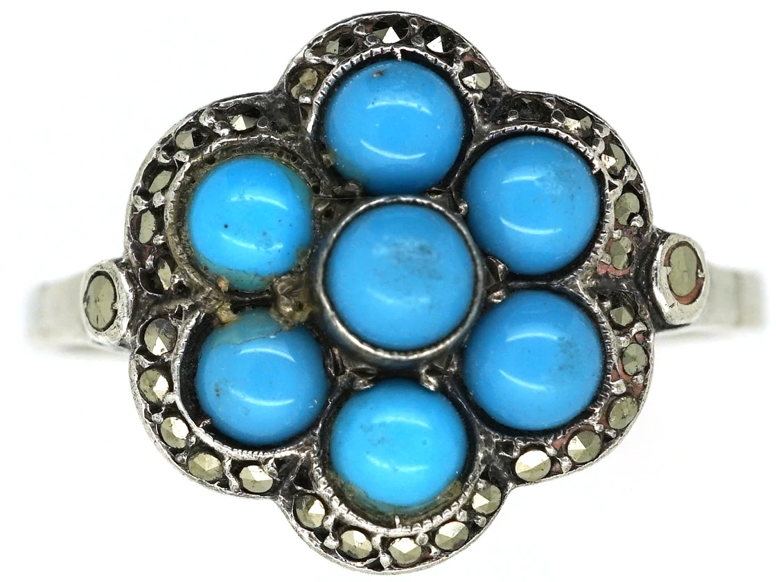 clusterA group of small diamonds or colourful gemstones grouped together to form a cluster, mimicking the look of a larger gem. Often this group can surround a larger center stone. ring that matches a pair of drop cluster earrings listed on our site. It is set with turquoiseTurquoise is an opaque gem and is often formed in what is called matrix, a black or brown veining derived from the host rock in which the gem forms. In fine jewellery, unblemished sky blue turquoise is the ideal, although regularly patterned matrix turquoise is also sought-after. blue glass and marcasiteThe marcasite of jewellery is in fact iron pyrite as marcasite itself is too brittle alone for the durability required of a piece. This jewellery marcasite is sometimes called ‘fool’s gold’ given its heavily metallic appearance. Marcasite of this kind also offers a kind of iridescence, explaining its use as a more affordable diamond replacement that wi… to imitate turquoise and rose diamonds. It was made circa 1920.