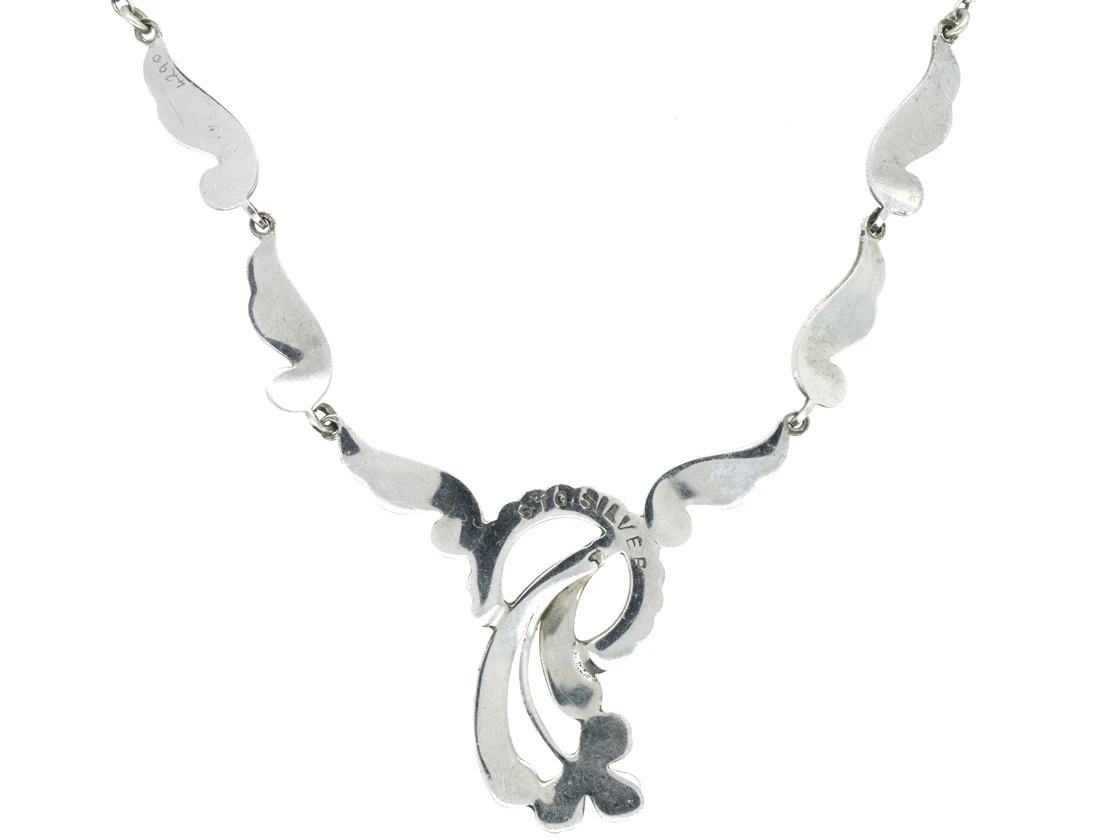 A pretty and delicate looking Art DecoA movement within the arts between the two Great Wars (1920-1935) across Europe and the US, characterized by its clean, geometric designs. The aesthetic was intended to celebrate an age of progress and the modernity of the machine. silverA metallic element which is malleable and ductile, and white in colour, making it ideal for use in jewellery. It is usually mixed with copper to improve its hardness.
