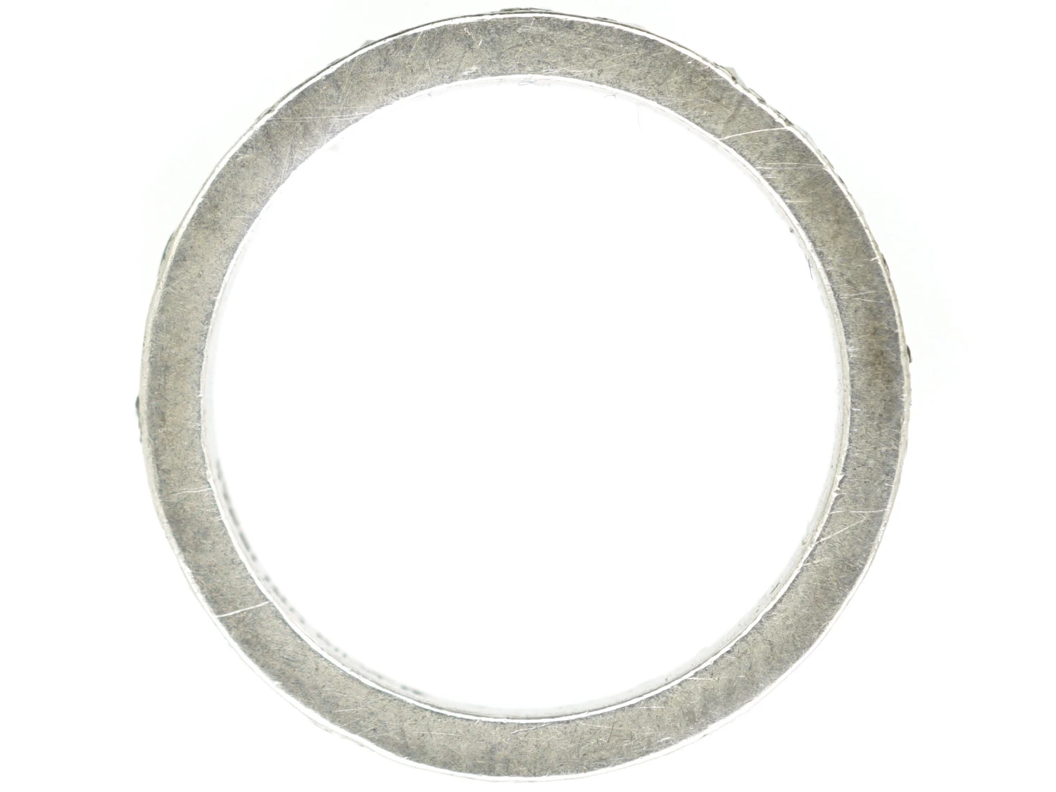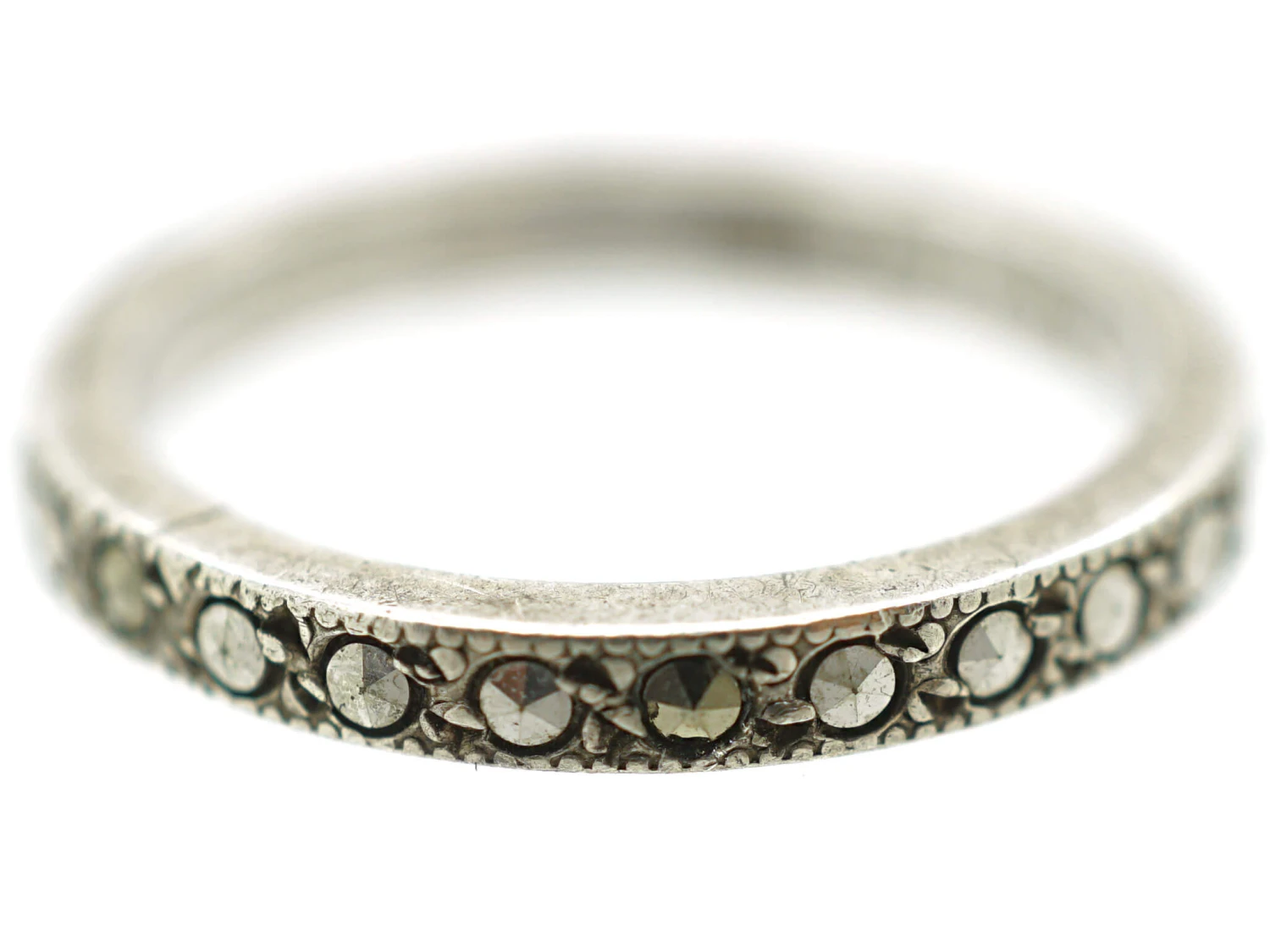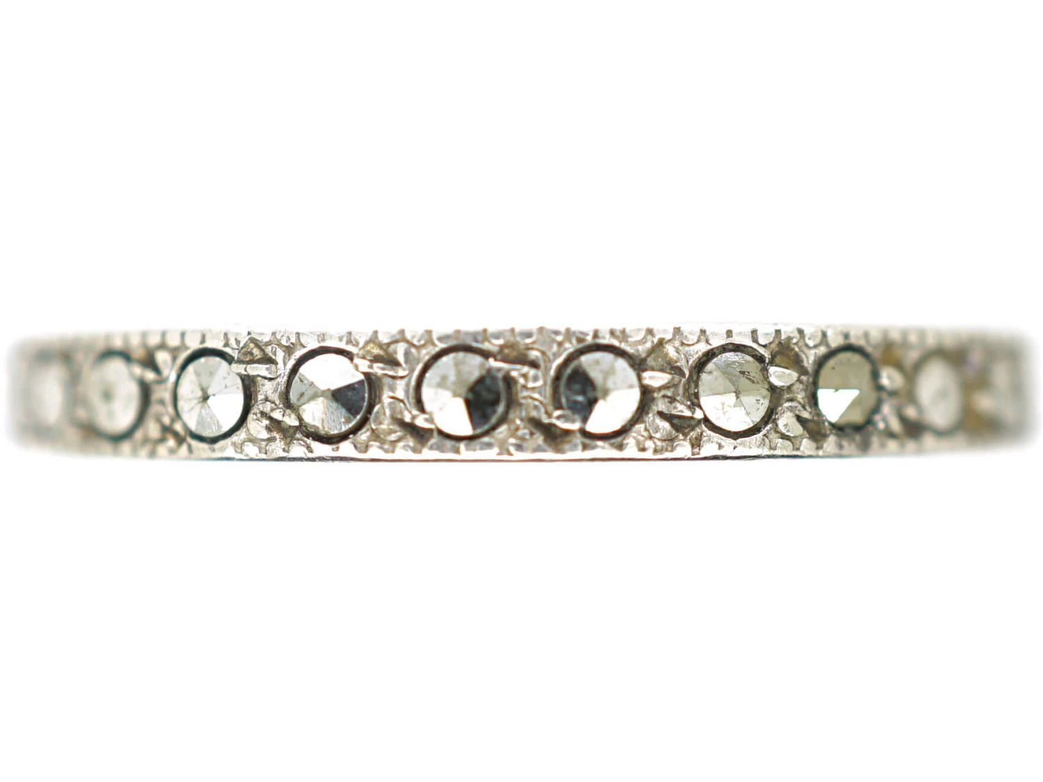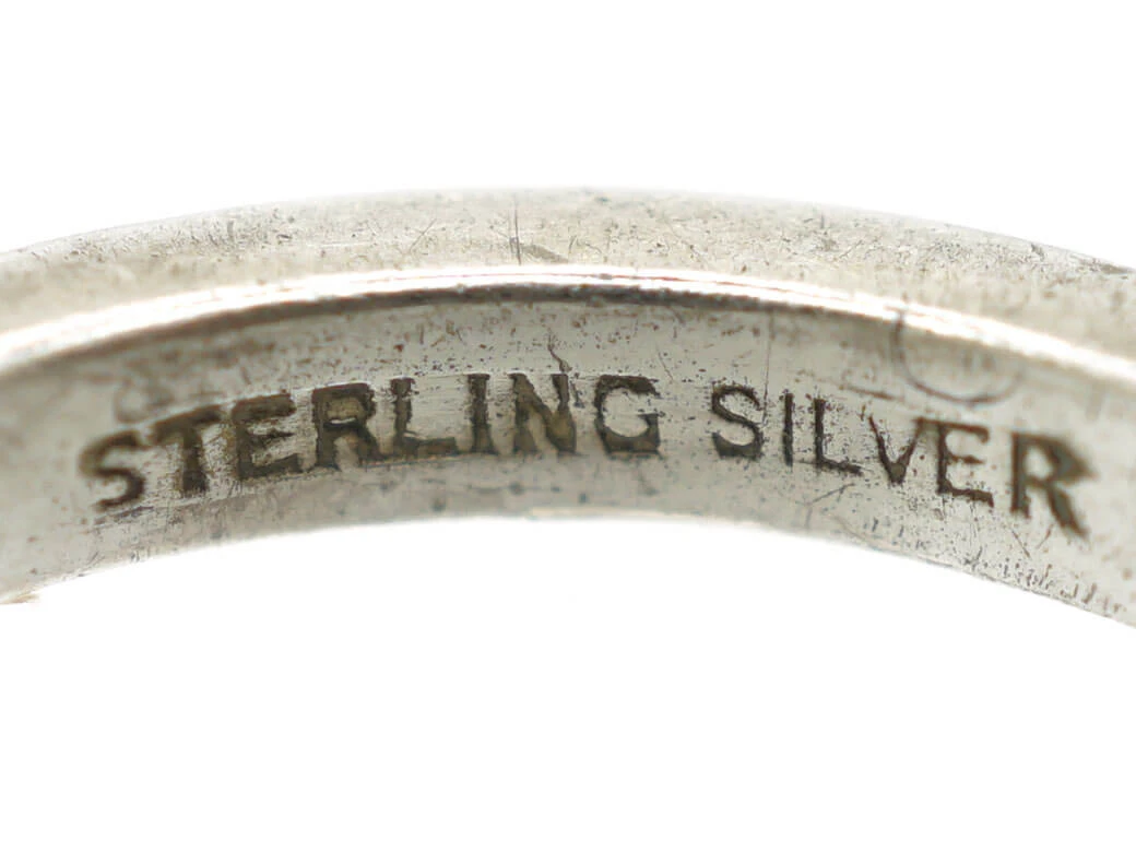 that was made in the 1930-1940 period and has been set with matched marcasiteThe marcasite of jewellery is in fact iron pyrite as marcasite itself is too brittle alone for the durability required of a piece. This jewellery marcasite is sometimes called ‘fool’s gold’ given its heavily metallic appearance. Marcasite of this kind also offers a kind of iridescence, explaining its use as a more affordable diamond replacement that wi… (iron pyrites) all around. This ring cannot be sized.