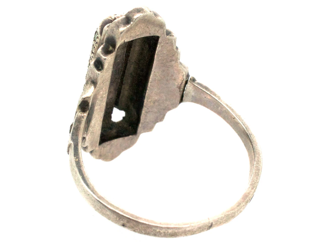 A well designed Art DecoA movement within the arts between the two Great Wars (1920-1935) across Europe and the US, characterized by its clean, geometric designs. The aesthetic was intended to celebrate an age of progress and the modernity of the machine. ring that was made in Germany circa 1920-1930. It is silverA metallic element which is malleable and ductile, and white in colour, making it ideal for use in jewellery. It is usually mixed with copper to improve its hardness.