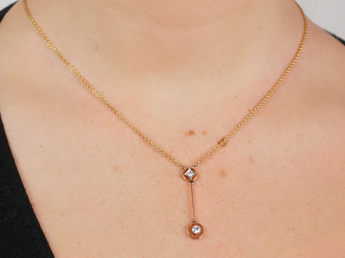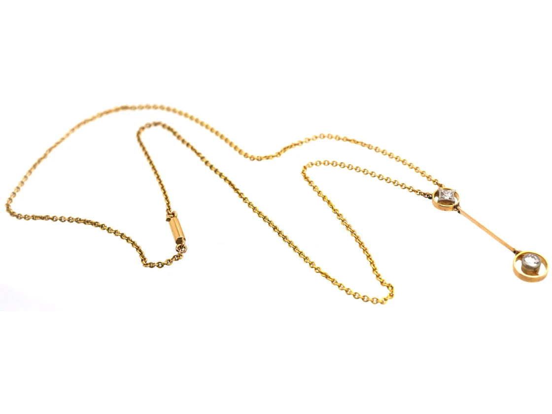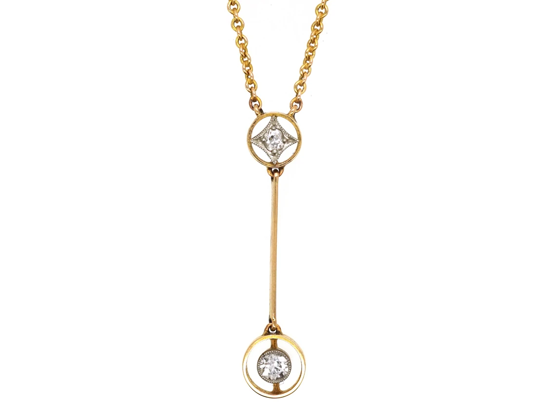 A lovely quality Art DecoA movement within the arts between the two Great Wars (1920-1935) across Europe and the US, characterized by its clean, geometric designs. The aesthetic was intended to celebrate an age of progress and the modernity of the machine. 15ct62.5% pure gold (or 625 parts pure gold and 375 parts other metals). Popular during the Victorian, Edwardian and Art Deco eras but was discontinued in the mid-1930s. gold and two stone diamondA precious, lustrous gemstone made of highly compressed carbon. Diamonds are one of the hardest materials known to mankind. Colours of diamonds range from colourless, yellow, orange and brown to almost black. Natural coloured (or ‘fancy’) diamonds can be extremely rare. The cut, colour, clarity and carat weight of a diamond are the criteria jewellers use… pendant in it’s original case. It is a simple and striking design which can be worn anywhere.