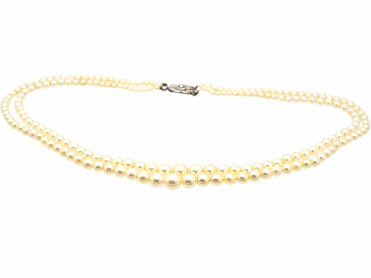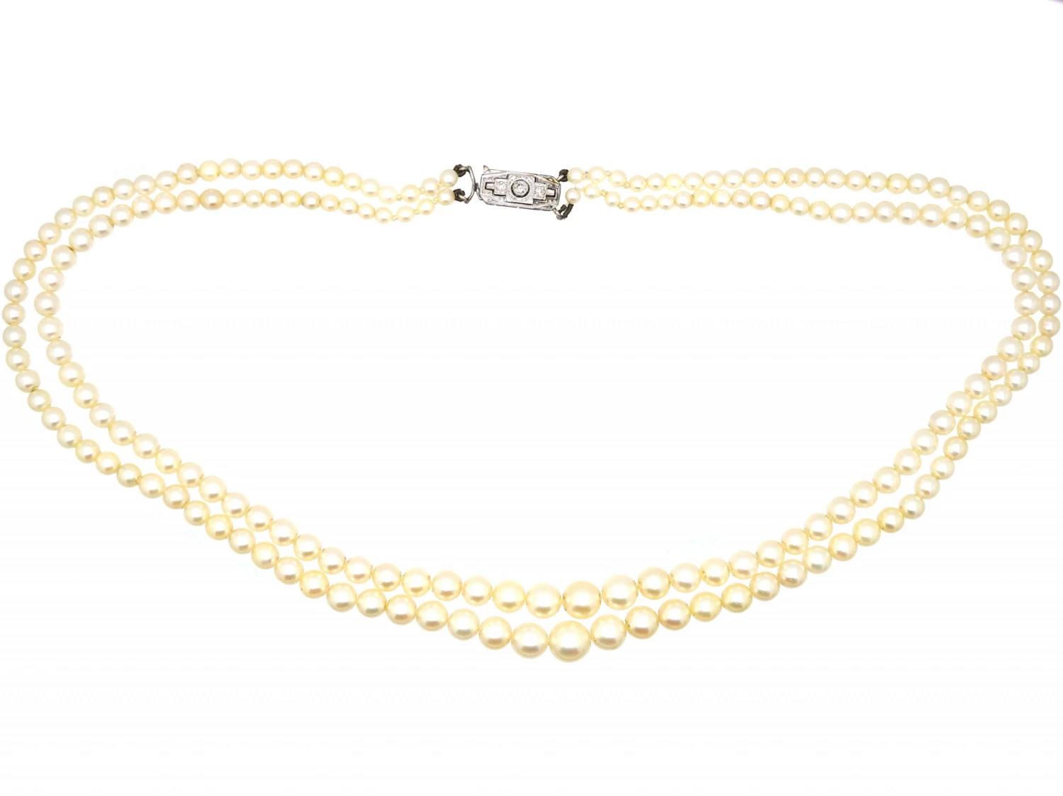 A good double strand of cultured pearls that date from the 1930s. The pearls are graded to a maximum of 8mm and are a beautiful creamy whitish grey colour and very well matched. The stringing is good with separately knotted thread between the pearls near the clasp. The art DecoA movement within the arts between the two Great Wars (1920-1935) across Europe and the US, characterized by its clean, geometric designs. The aesthetic was intended to celebrate an age of progress and the modernity of the machine. geometric clasp is 18ct75% pure gold (or 750 parts pure gold and 250 parts other metals) white goldWhite gold is an alloy of gold and at least one other white metal – most often nickel or palladium (both of which act as a bleaching agent to reduce the natural yellow colour of the gold). and has been set with three diamonds. It has a good hook system that is secure. One strand is longer than the other so when worn it looks really pretty.