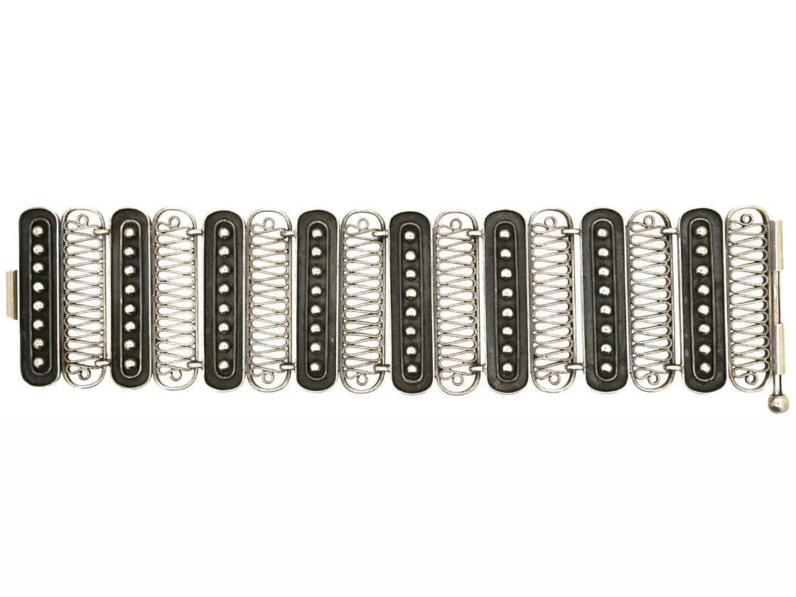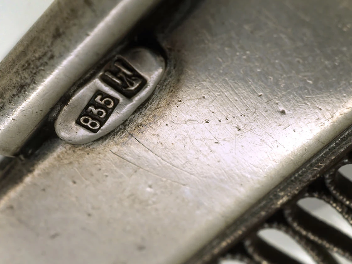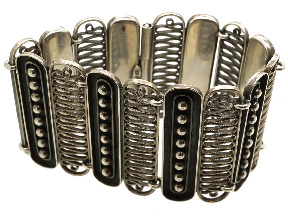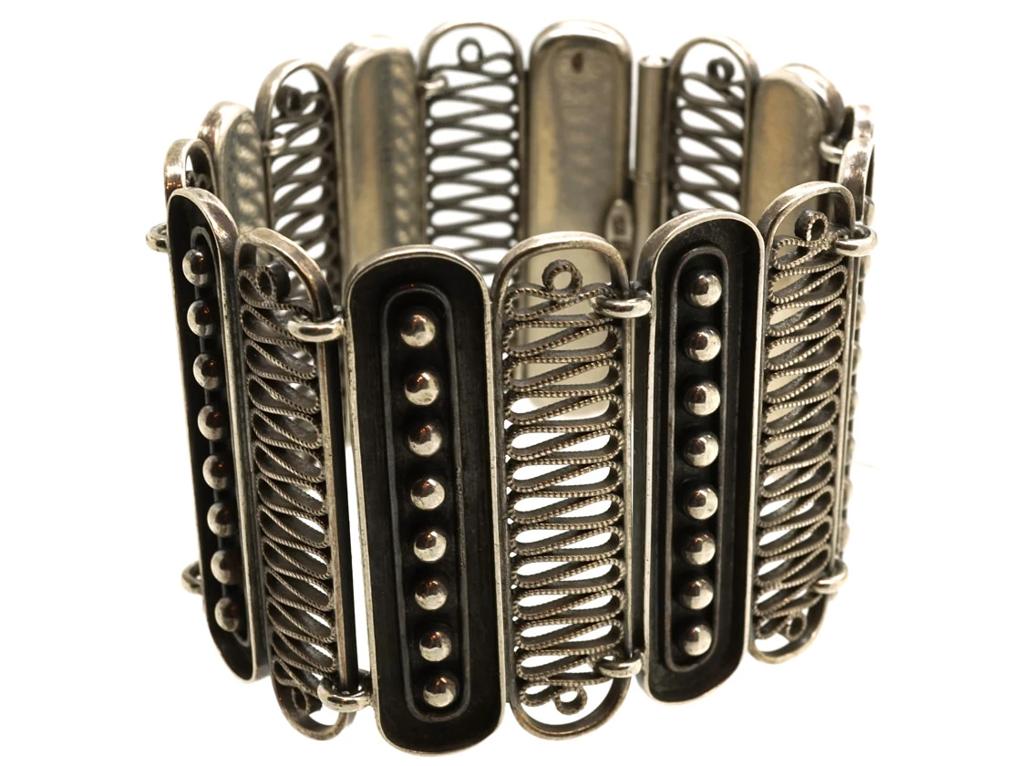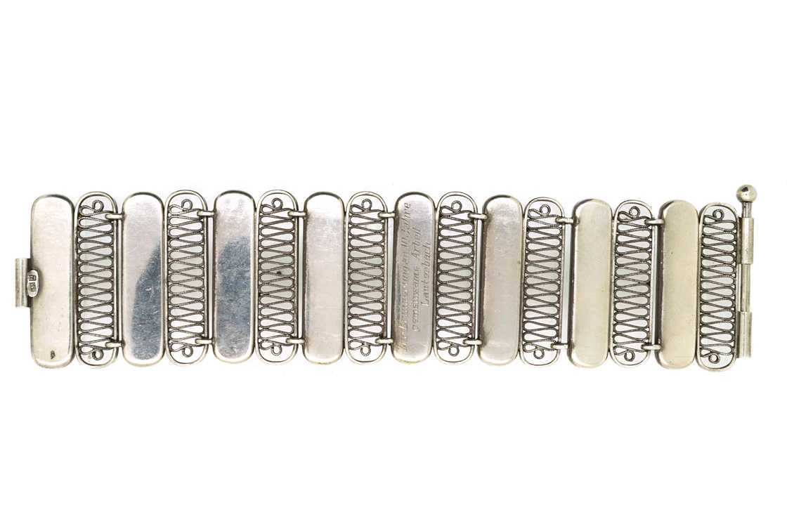 This bracelet has a really strong design. It is wide and has solid and openwork decoration. There is an inscription from grateful workers to their boss in German. However it has passed on to another generation and hopefully to a new owner at some pointA unit of weight for a diamond, being one-hundredth of a metric carat. It is used for weights that are decimal fractions of a carat, and all figures after the second decimal point are, in the diamond and jewellery trade, generally discarded.!