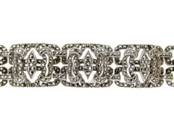 bracelet studded with marcasiteThe marcasite of jewellery is in fact iron pyrite as marcasite itself is too brittle alone for the durability required of a piece. This jewellery marcasite is sometimes called ‘fool’s gold’ given its heavily metallic appearance. Marcasite of this kind also offers a kind of iridescence, explaining its use as a more affordable diamond replacement that wi… (iron pyrites). It was the costume jewelleryJewellery designed for wear with current fashions and usually made of inexpensive materials. Usually applied to two classes of jewellery: gem-set imitations, which resemble precious jewellery but are made of silver (sometimes rhodium-coated) or pinchbeck and set with substitutes for gemstones, e.g. marcasite, paste or synthetic gemstones; although usually th… of the 1920s and intended to imitate rose diamonds. This bracelet is very effective.
