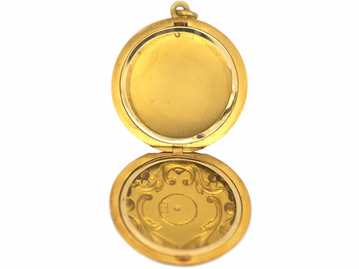 A beautiful 14ct58.5% pure gold (or 585 parts pure gold to 415 parts other metals) gold heavy gage round locket that was made in the Art NouveauA movement within the arts, particularly jewellery, evolving out of a response to mass production and the industrial revolution (1890-1915). Jewellery of this period was heavily influenced by nature and femininity, with its sweeping lines and organic motifs. period in America circa 1900-1910. The front has repousse detail of stylised leaves in typical flowing forms that the Art Nouveau style propounded. Repousse is shaped by hammering from the reverse side to create a design in low relief. Inside are two compartments for photographs. This locket is as wearable today as it was over one hundred years ago