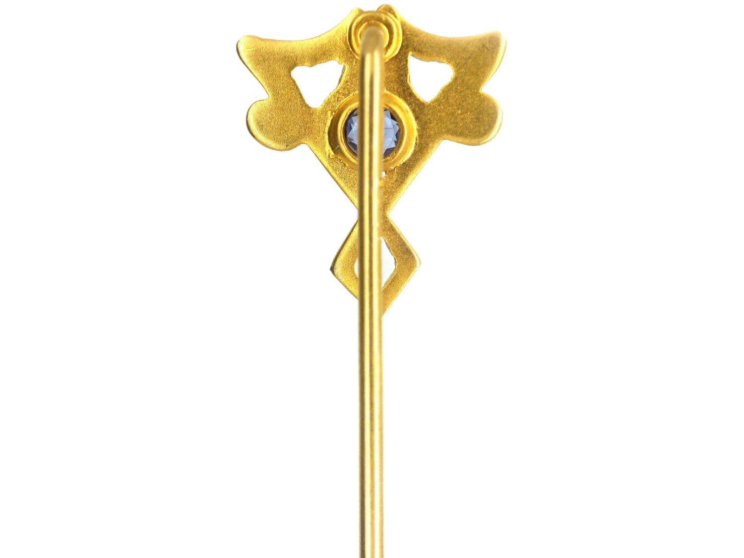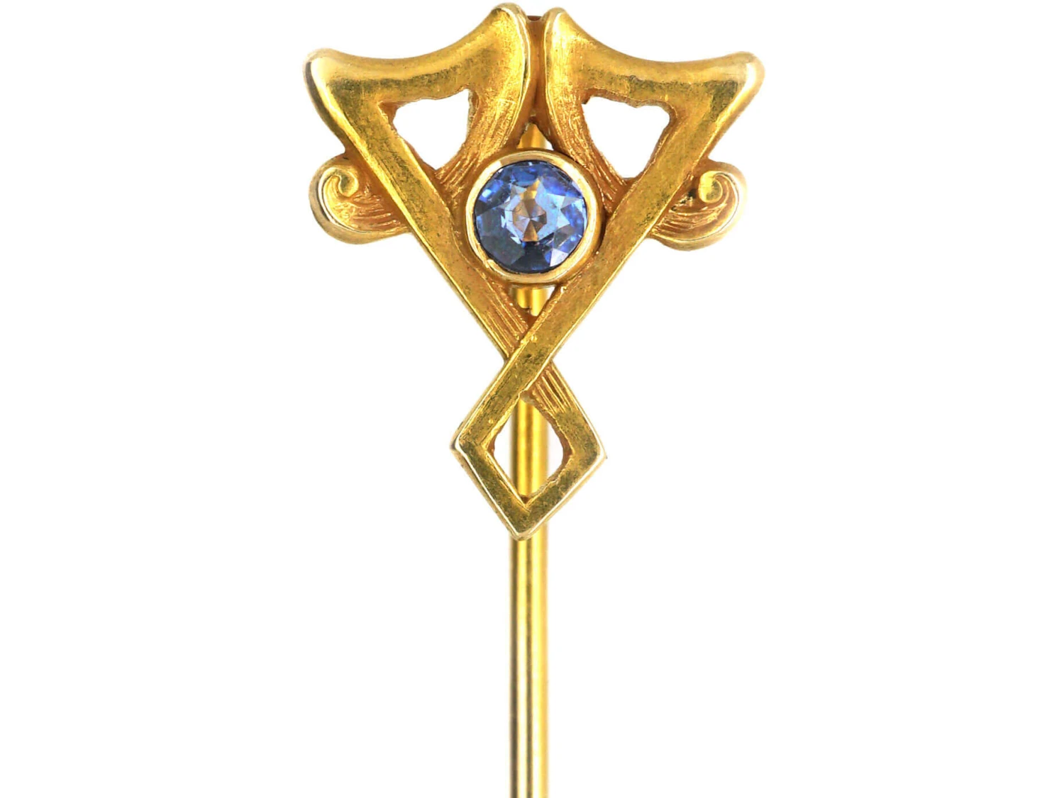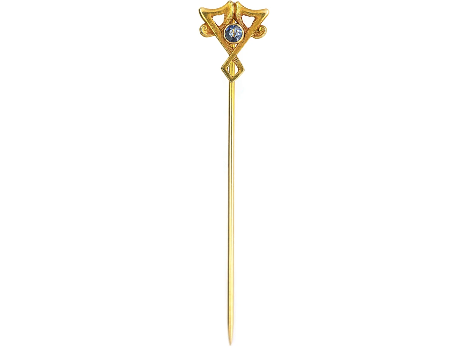 A very stylish 14ct58.5% pure gold (or 585 parts pure gold to 415 parts other metals) gold tie pin that was made in America circa 1900-1910. It is typical of the Art NouveauA movement within the arts, particularly jewellery, evolving out of a response to mass production and the industrial revolution (1890-1915). Jewellery of this period was heavily influenced by nature and femininity, with its sweeping lines and organic motifs. style that was prevalent at the time. It has been set with a sapphireBlue is the best-known colour for this gemstone but it can be found in all colours of the spectrum. After diamond, sapphire is the hardest gemstone.
