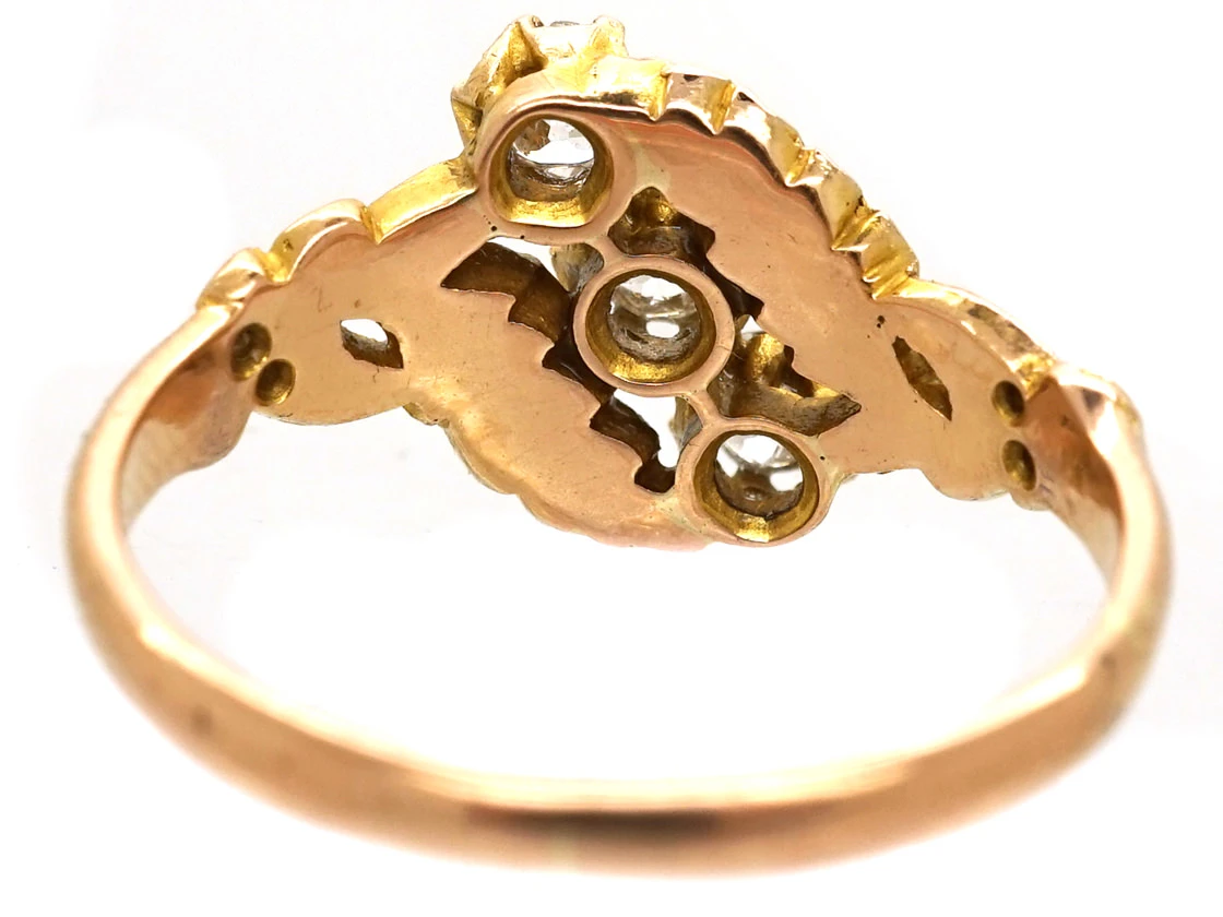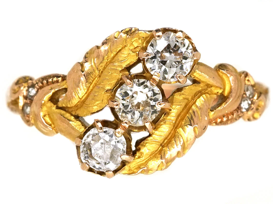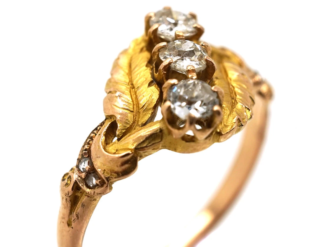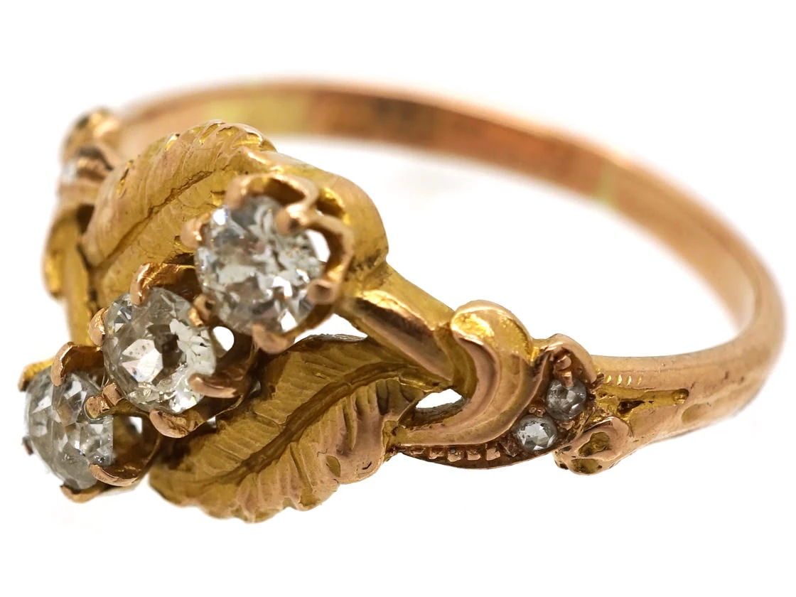 An Art NouveauA movement within the arts, particularly jewellery, evolving out of a response to mass production and the industrial revolution (1890-1915). Jewellery of this period was heavily influenced by nature and femininity, with its sweeping lines and organic motifs. 18ct75% pure gold (or 750 parts pure gold and 250 parts other metals) gold ring set with three old mine cutAn 18th, 19th and early 20th century diamond shape, typically cushion or asymmetrical, marked by a small table, a high crown and a large culet. Culets are the small flat facets at the bottom of a stone which appear to the untrained eye as a hole in the middle of the stone. Before the advent of modern machinery which allows for the precise faceting we see tod… diamonds and small rose diamonds on the shouldersThe point on a ring where the central section meets the shank or band, often carved, decorated or inlaid with small diamond accent stones.. It is beautifully made with branch and leaf detail. It was made circa 1900-1910.