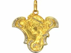 An unusual 18ct75% pure gold (or 750 parts pure gold and 250 parts other metals) gold Art NouveauA movement within the arts, particularly jewellery, evolving out of a response to mass production and the industrial revolution (1890-1915). Jewellery of this period was heavily influenced by nature and femininity, with its sweeping lines and organic motifs. pendant, finely made and set with graduated rose diamonds in ornate volutes around the edge. In the centre is a young girl with a rose diamondA precious, lustrous gemstone made of highly compressed carbon. Diamonds are one of the hardest materials known to mankind. Colours of diamonds range from colourless, yellow, orange and brown to almost black. Natural coloured (or ‘fancy’) diamonds can be extremely rare. The cut, colour, clarity and carat weight of a diamond are the criteria jewellers use… bandeau. On the reverse is a hinged locket. The roots of the medal jewel are found in the archaeological revival period and, as design moved towards the “fin d’siècle”, the Art Nouveau style came to influence the design. Feminine figures, flowing hair, flowers and classic subjects such as the “Three Graces” and “Four Seasons” appeared as the more coin-like medals waned. Medals, appearing around 1899, with their diamond accents, proved to be a turning pointA unit of weight for a diamond, being one-hundredth of a metric carat. It is used for weights that are decimal fractions of a carat, and all figures after the second decimal point are, in the diamond and jewellery trade, generally discarded. for the popularity of the medal jewel. Today these pieces are very sought after.
