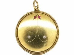 A very pretty 18ct75% pure gold (or 750 parts pure gold and 250 parts other metals) gold locket that was made circa 1900-1910. It is in the Art NouveauA movement within the arts, particularly jewellery, evolving out of a response to mass production and the industrial revolution (1890-1915). Jewellery of this period was heavily influenced by nature and femininity, with its sweeping lines and organic motifs. style that was popular at the time. The motif is a finely engraved stem with rubyOne of the most valuable gemstones on earth. From the corundum family, the red variety being ruby and the blue, sapphire. With the exception of the diamond, corundum is the hardest of the gemstones on the Mohs scale scoring a 9. set leaves and rose diamondA precious, lustrous gemstone made of highly compressed carbon. Diamonds are one of the hardest materials known to mankind. Colours of diamonds range from colourless, yellow, orange and brown to almost black. Natural coloured (or ‘fancy’) diamonds can be extremely rare. The cut, colour, clarity and carat weight of a diamond are the criteria jewellers use… set buds. It opens to reveal two compartments for photographs. It is a narrow locket so it is a smart look when worn.