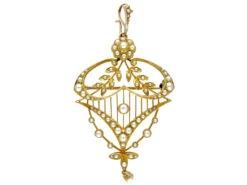 A beautifully designed 15ct62.5% pure gold (or 625 parts pure gold and 375 parts other metals). Popular during the Victorian, Edwardian and Art Deco eras but was discontinued in the mid-1930s. gold pendant which can also be worn as a brooch. It is set with naturalA natural stone is called such because it has not been subjected to any treatments. split pearls and was made circa 1900-1910, the best period for this type of jewellery. It looked wonderful with the lace and ivory colours worn at the the time, and still looks stunning when worn with todays clothes.