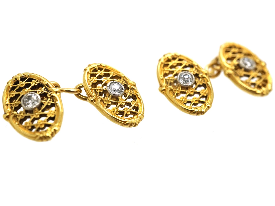 A beautiful pair of 18ct75% pure gold (or 750 parts pure gold and 250 parts other metals) gold oval cufflinks set with a good bright white diamondA precious, lustrous gemstone made of highly compressed carbon. Diamonds are one of the hardest materials known to mankind. Colours of diamonds range from colourless, yellow, orange and brown to almost black. Natural coloured (or ‘fancy’) diamonds can be extremely rare. The cut, colour, clarity and carat weight of a diamond are the criteria jewellers use… in each one. They were most likely made in Austria and exported to France circa 1900-1910. This is proved by the “owl” mark which the French used since 1893 to check the importation and to guarantee that they were 18ct gold. They are a finely pierced design with scrolls and florets.