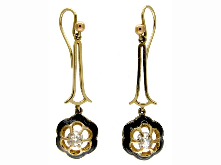 A classic pair of black enamelA pigmented glass-like material used in powdered form and fused onto the metal surface of a piece of jewellery. and diamondA precious, lustrous gemstone made of highly compressed carbon. Diamonds are one of the hardest materials known to mankind. Colours of diamonds range from colourless, yellow, orange and brown to almost black. Natural coloured (or ‘fancy’) diamonds can be extremely rare. The cut, colour, clarity and carat weight of a diamond are the criteria jewellers use… drop earrings. They are French, circa 1880. 18ct75% pure gold (or 750 parts pure gold and 250 parts other metals) gold with 2 20 pointA unit of weight for a diamond, being one-hundredth of a metric carat. It is used for weights that are decimal fractions of a carat, and all figures after the second decimal point are, in the diamond and jewellery trade, generally discarded. old mine cutAn 18th, 19th and early 20th century diamond shape, typically cushion or asymmetrical, marked by a small table, a high crown and a large culet. Culets are the small flat facets at the bottom of a stone which appear to the untrained eye as a hole in the middle of the stone. Before the advent of modern machinery which allows for the precise faceting we see tod… diamonds.