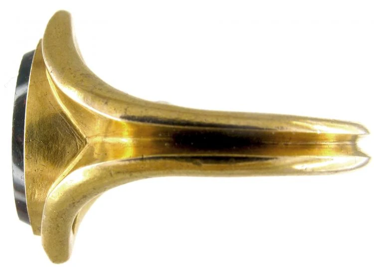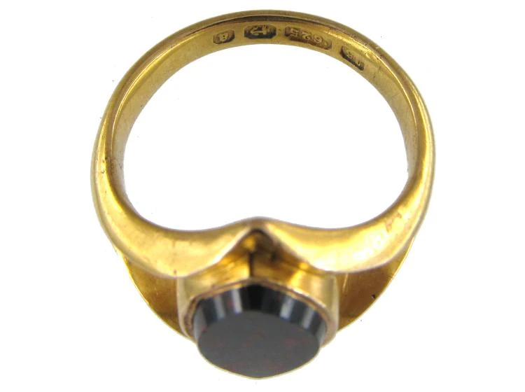 A most unusual version of a signet ringA ring with a central plaque on which one’s initials, a seal, or a crest is engraved.. The gold design is clever with inverted sections. It is 15ct62.5% pure gold (or 625 parts pure gold and 375 parts other metals). Popular during the Victorian, Edwardian and Art Deco eras but was discontinued in the mid-1930s. gold and set with a lozenge shape bloodstoneA dark green to dark bluish-green variety of Chalcedony that is splattered with red or brown spots that resemble blood. The extent of the marking varies depending on the stone. Spots are favoured over larger stripes and markings..
